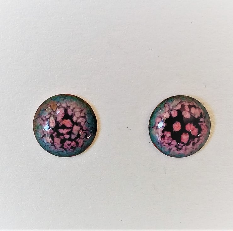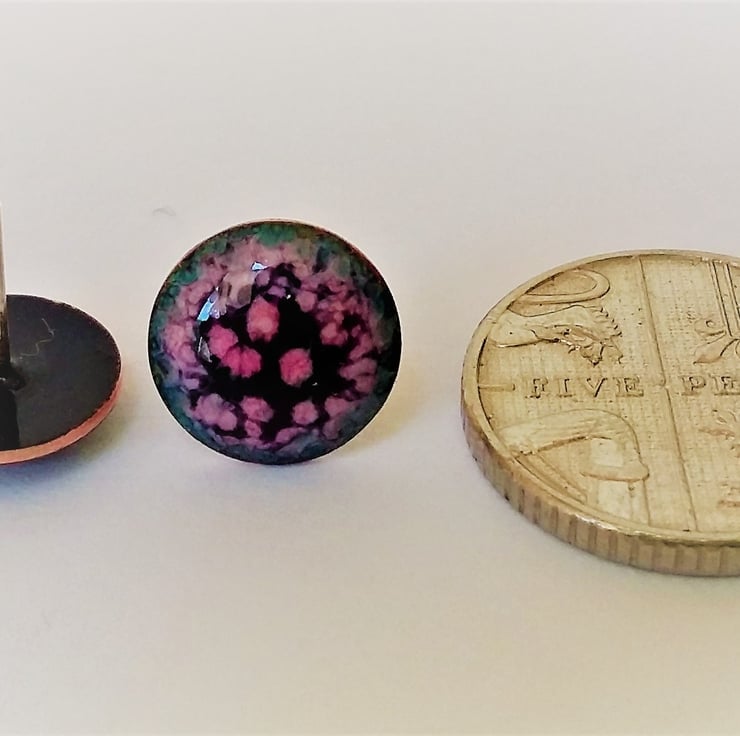 A pair of domed copper stud earrings in shades of pink and dark purple. The earrings have been kiln-fired and each measures 10mm in diameter, with sterling silver posts and scrolls (aka butterflies). The backs have been finished in glossy black enamel. They are supplied with a little organza pouch and POSTAGE IS FREE!
