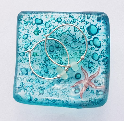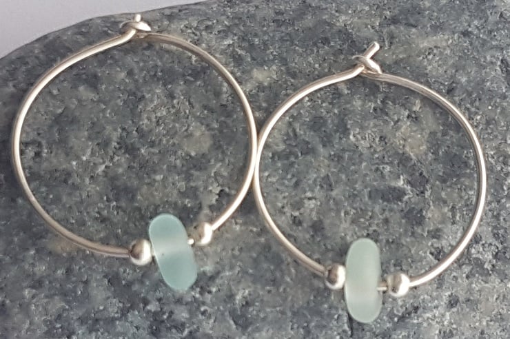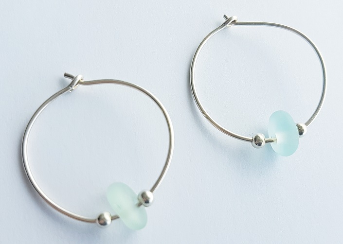 Sterling Silver Hoops with Handpicked Aqua Seaglass separated by sterling beads.