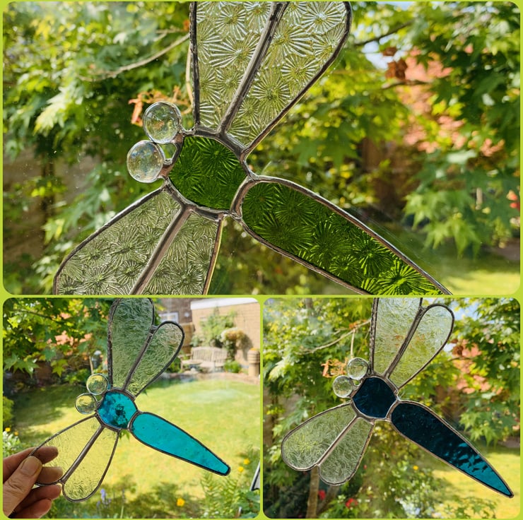 Dragonflies flit so quickly no sooner are they here but they’ve gone again. This dragonfly made from stained glass will stay put for a little longer than the real thing.