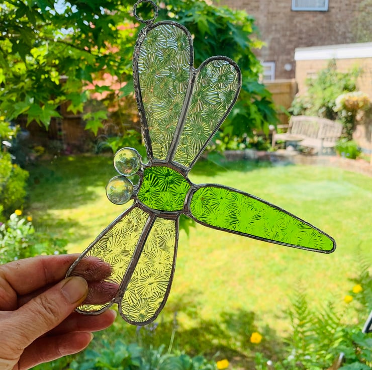 This dragonfly has been made from a beautiful lime green florentine glass with clear florentine glass for the wings. Each piece of glass has been hand cut, ground and foiled before being soldered together. Two clear glass nuggets have been used for the eyes. Twisters wire has been attached to the length of the wing to add strength and for hanging purposes.