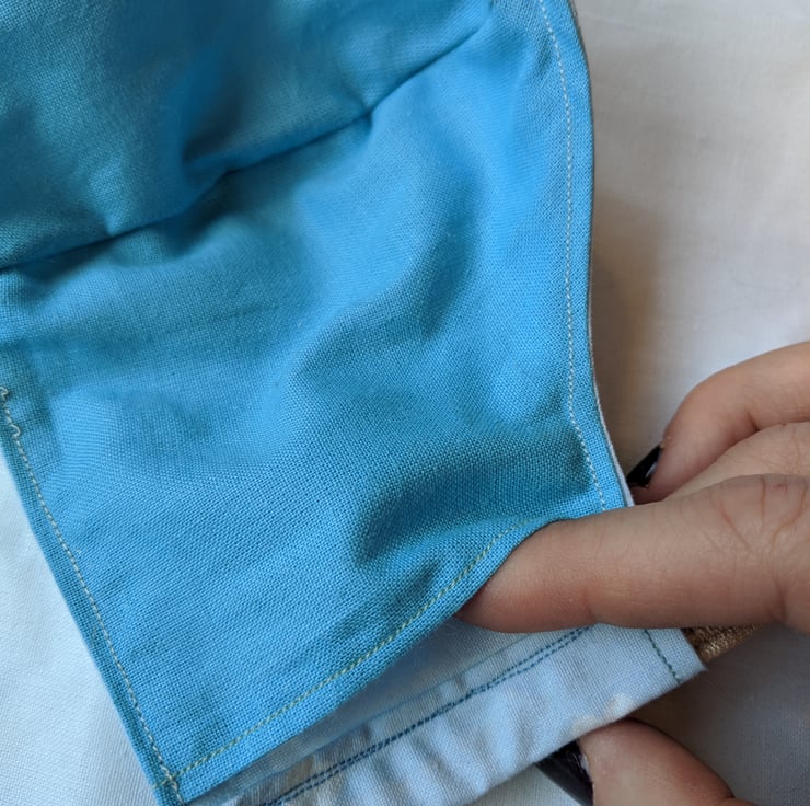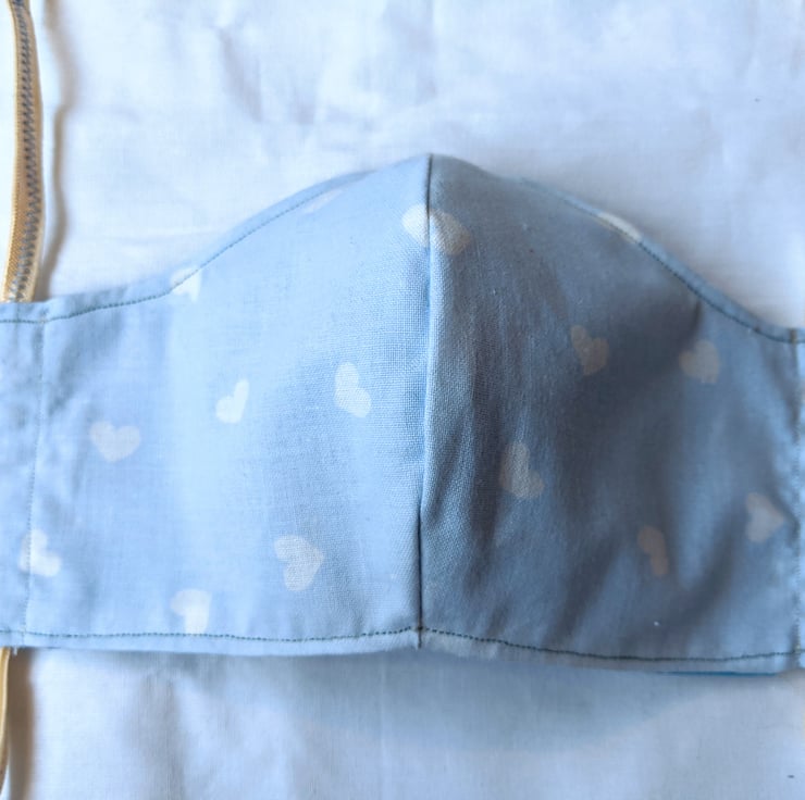 This is a face mask with elastic ties. It provides full coverage of the nose and mouth with a lightweight breathable fabric. The elastic used is fold-over elastic of the type used in lingerie, which is softer and more comfortable than ordinary elastic. The ties of the elastic are adjustable for a better fit. The lining is open, to allow insertion of a filter if desired (see photos).