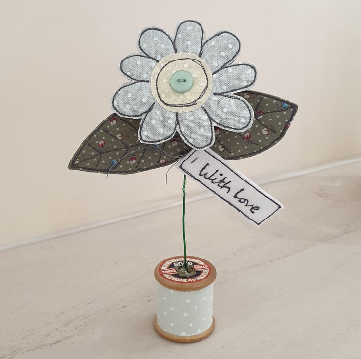 The daisy and leaves are created using 100% cotton fabric and wool mix felt, individually stitched using free motion machine embroidery and then cut out by hand with a pair of very sharp scissors.