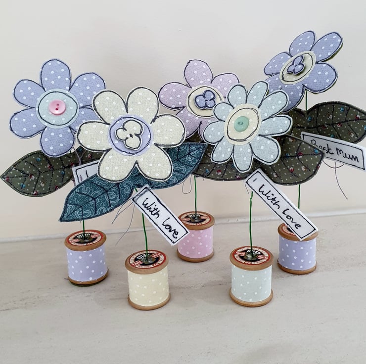 The daisy and leaves are created using 100% cotton fabric and wool mix felt, individually stitched using free motion machine embroidery and then cut out by hand with a pair of very sharp scissors.