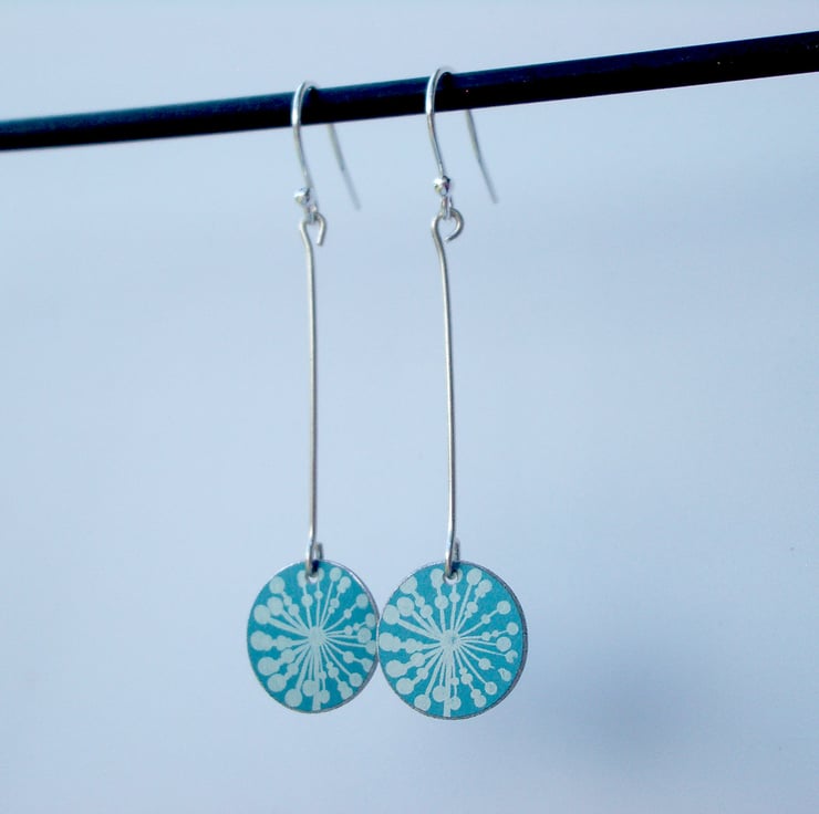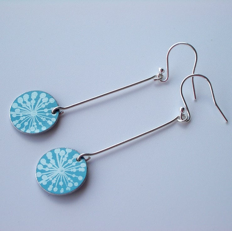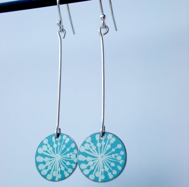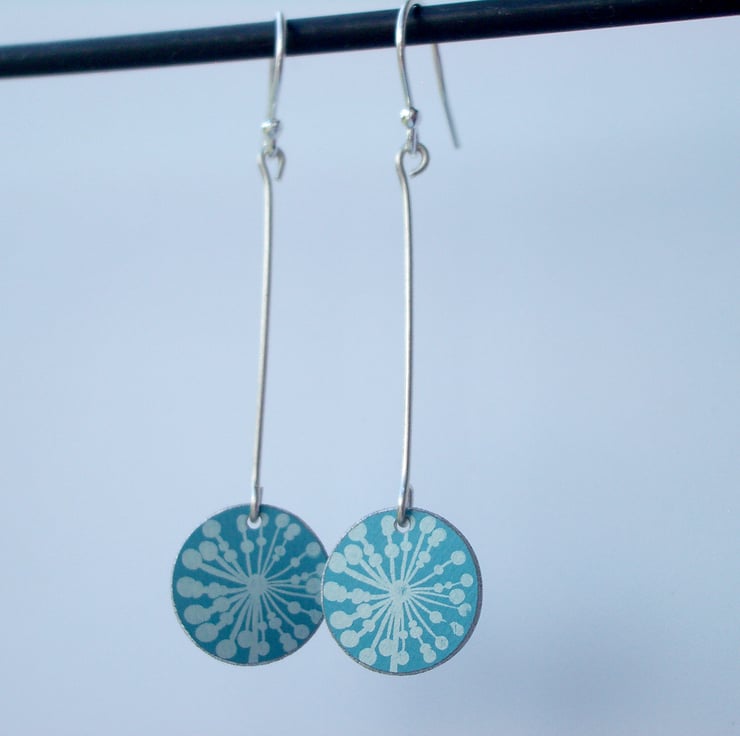 These dandelion clock earrings are made from aluminium which I have dyed in a teal blue and printed with a silver dandelion clock print. I cut out the circle shapes with a jeweller's saw and file the edges. The dandelion clocks hang from a long sterling silver wire which is attached to a sterling silver ear hook.