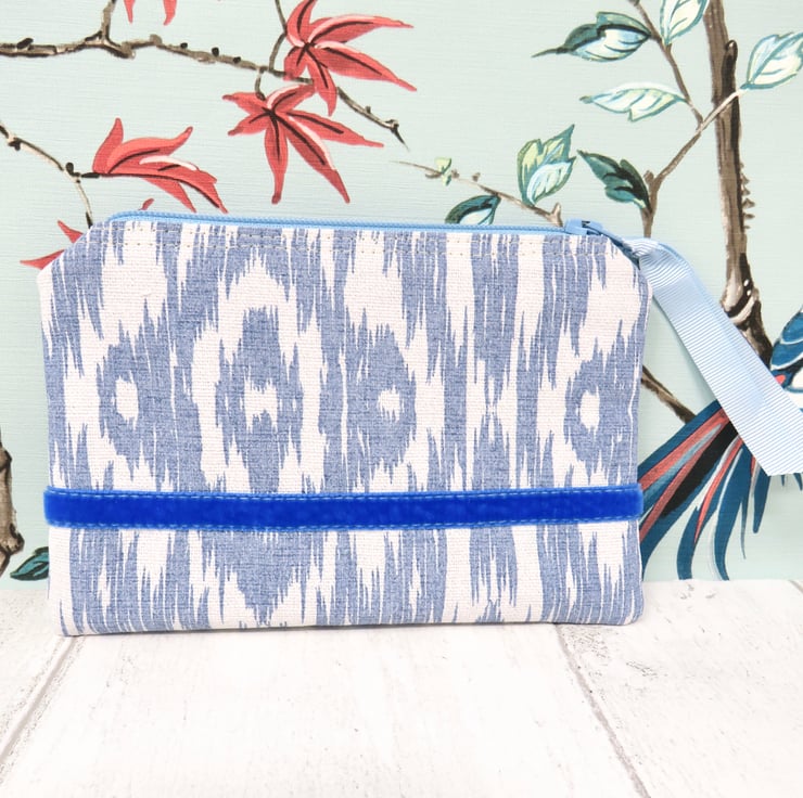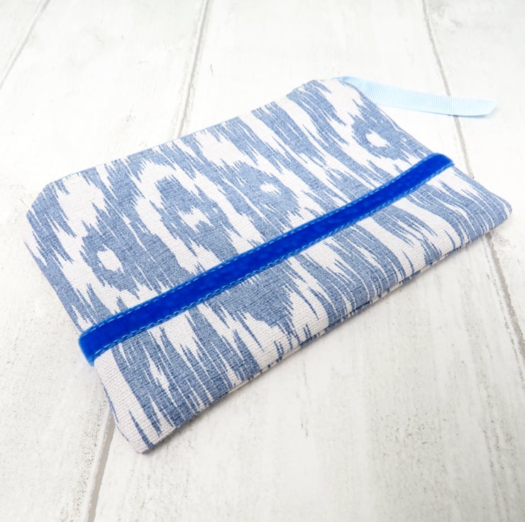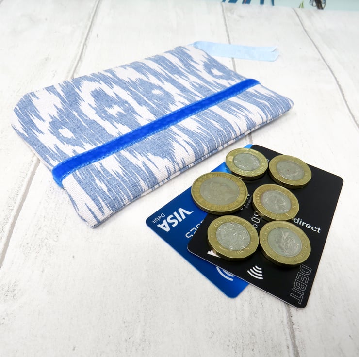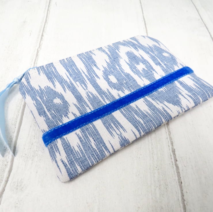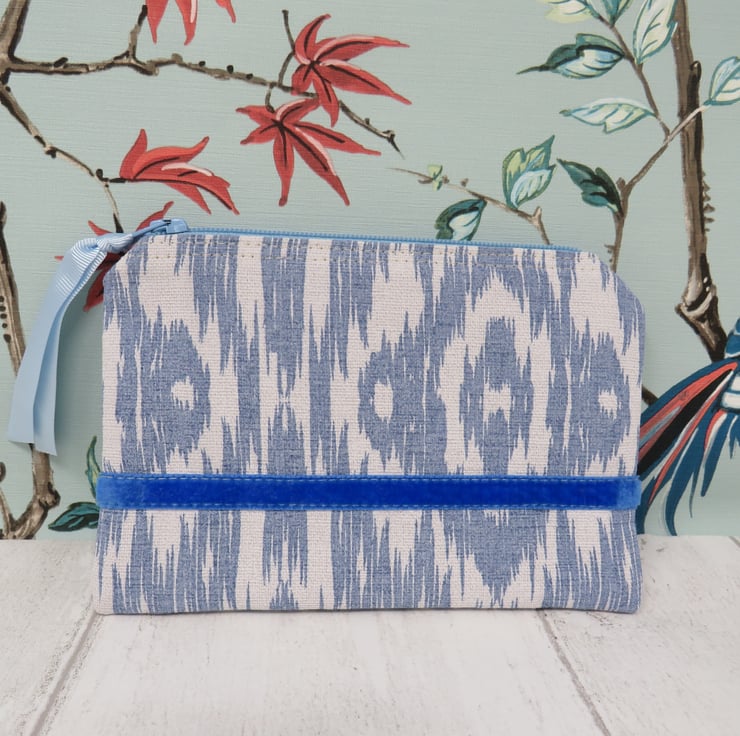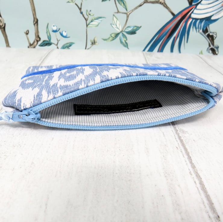 This useful coin purse is made in a blue and white abstract patterned cotton fabric. The lining is a grey and white striped cotton, whilst the blue zip closure has a pale blue gross grain ribbon pull. A lovely blue velvet ribbon trim sits on both sides of the purse.
