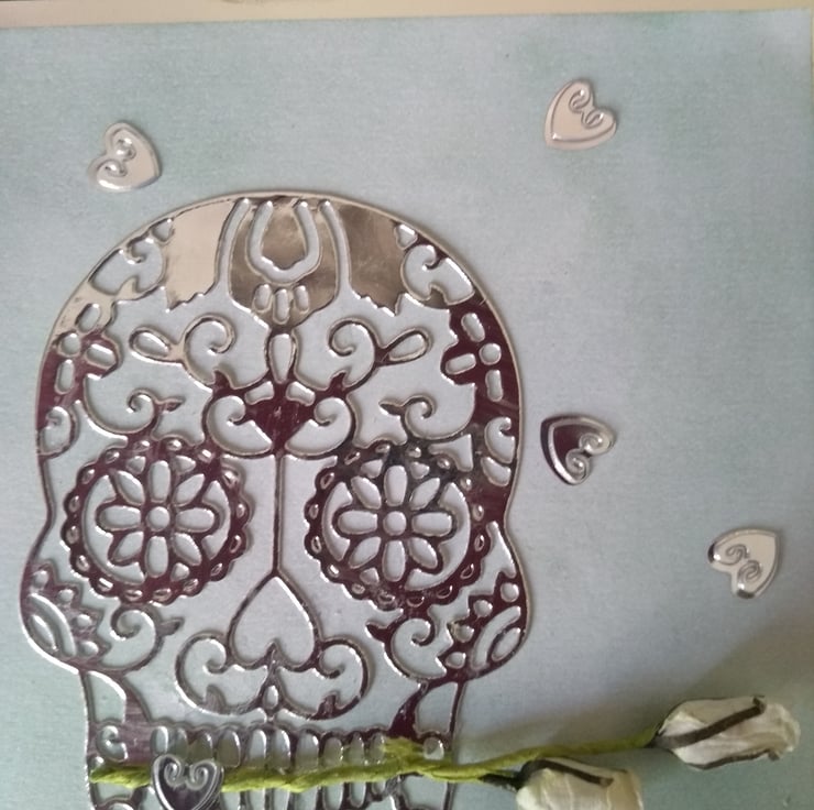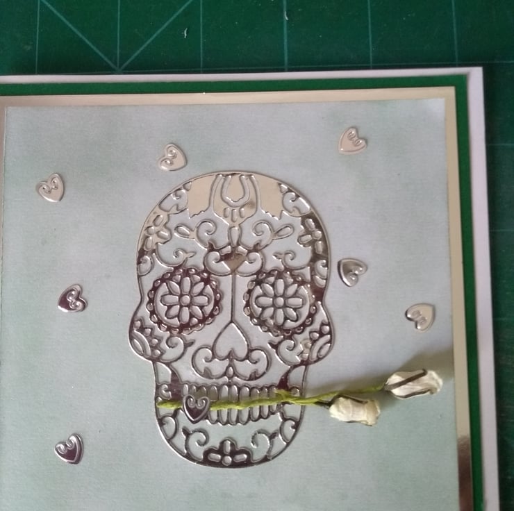 A completely handmade and uniquely designed card. Consisting of a skull die cut from silver mirri card. Mounted onto white card which has been hand coloured using green and silver inks. Then mounted onto silver card, then green card and finally onto quality pristine white card. Finished off with two white paper roses and silver hearts