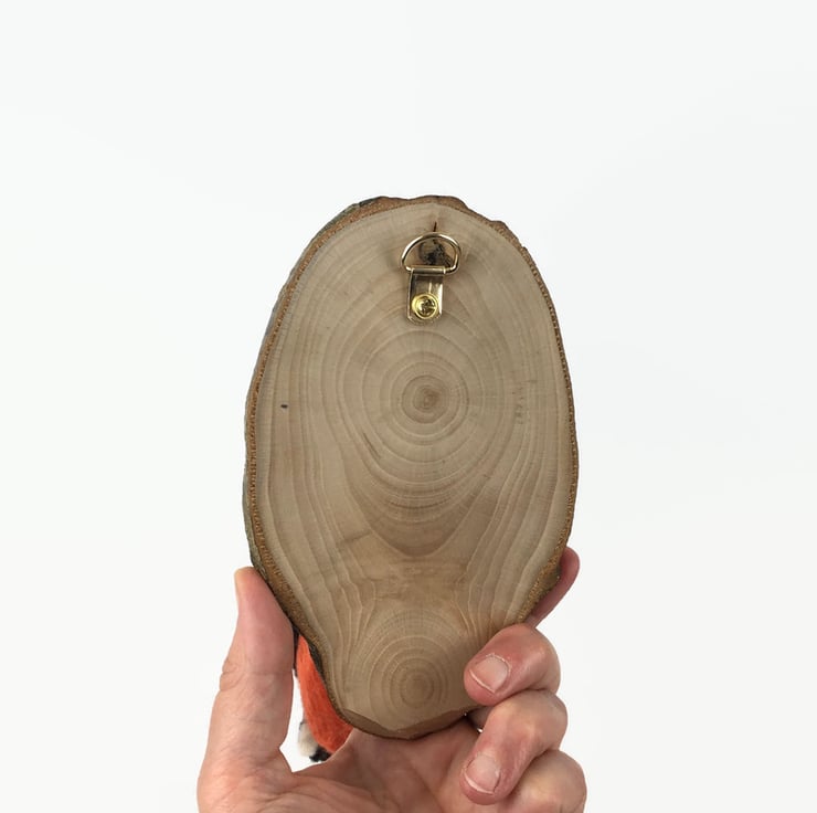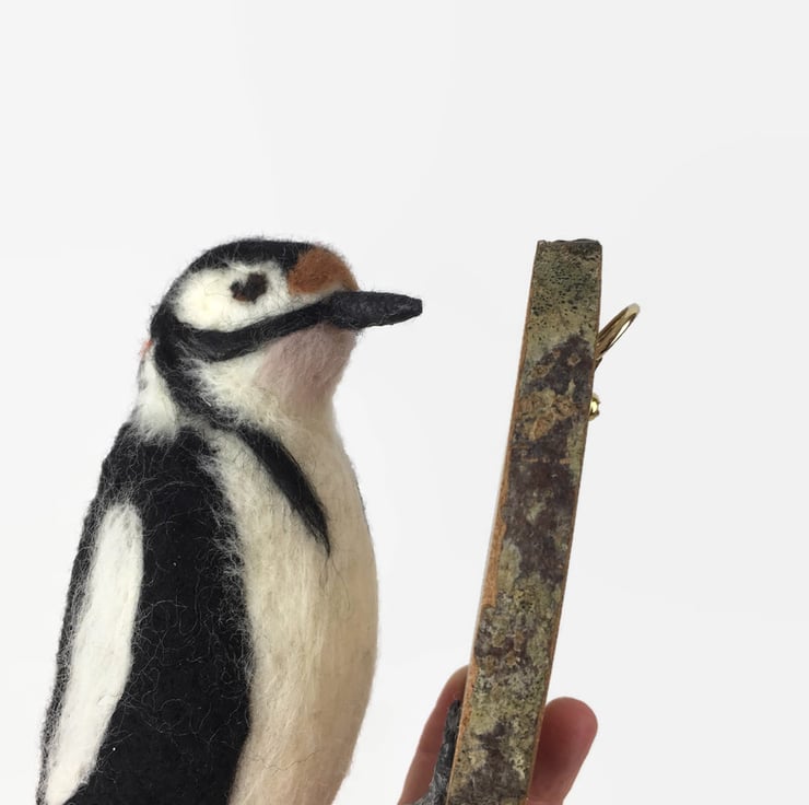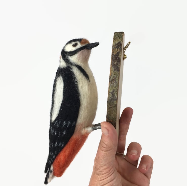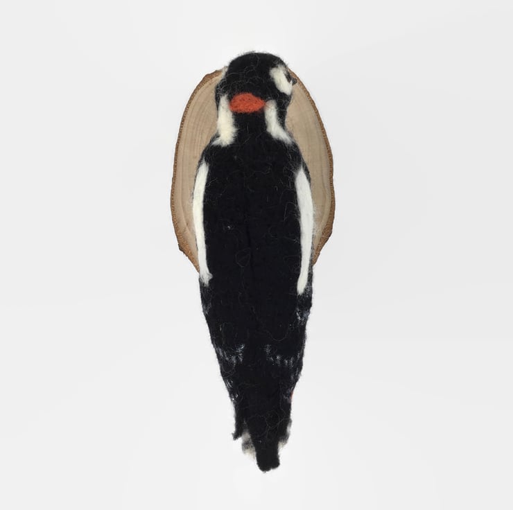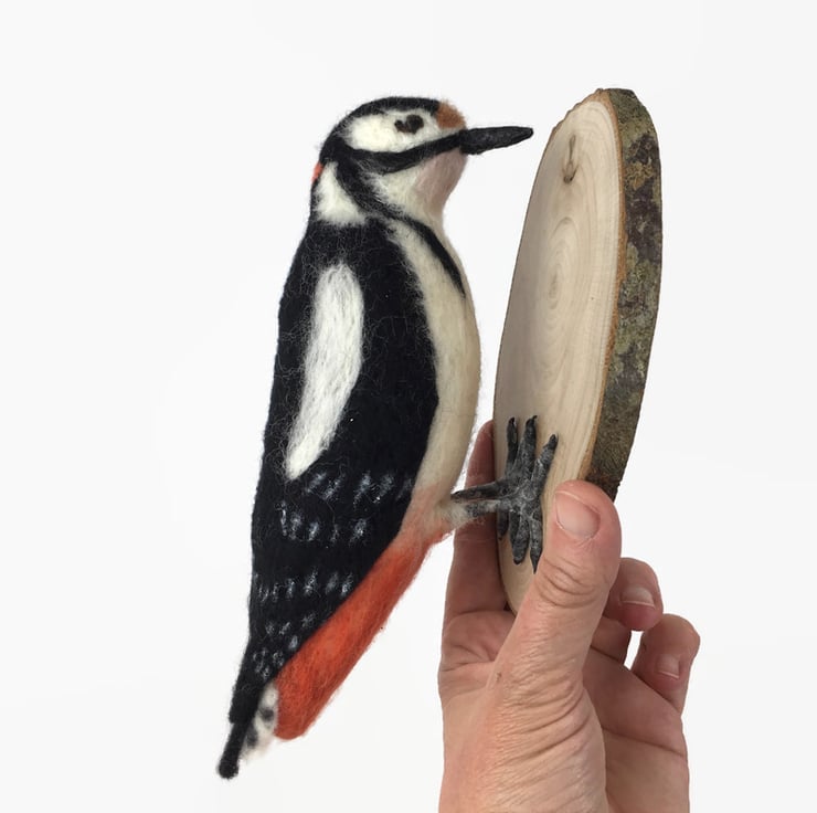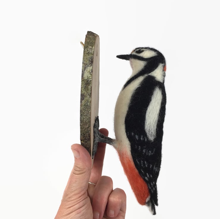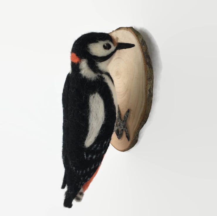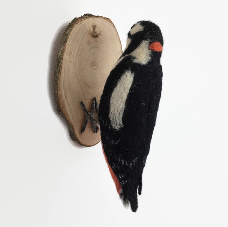 A roughly life-size woodpecker needle felted using woollen fibres and a barbed felting needle. A core of white wool has been needled into shape and covers with coloured merino wool fibres. The beak has been stiffened with wax and the legs formed from stiff wire covered in woollen fibres with a covering of wax. The woodpecker has then been mounted on a rustic wooden slice that has a picture hanger mounted on the reverse allowing the woodpecker to be mounted on the wall.
