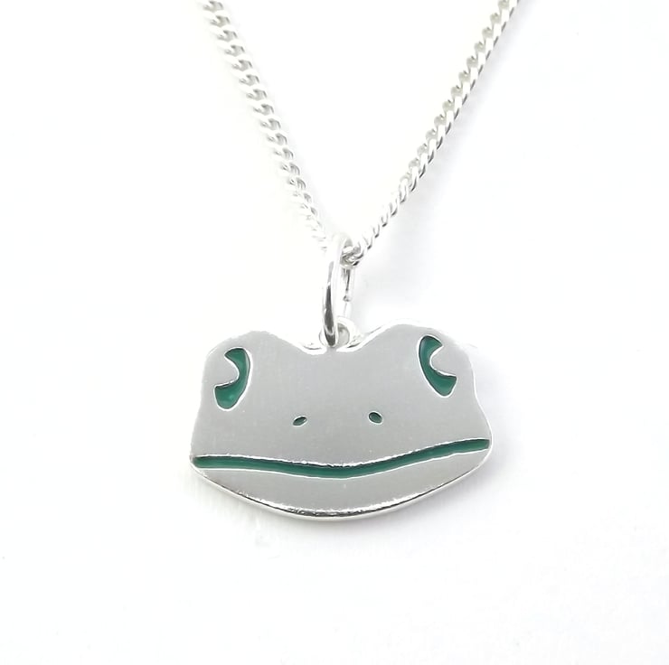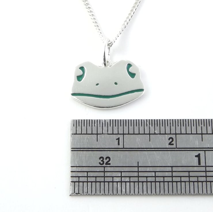 This dainty frog pendant has been lovingly handcrafted in Britain. It is made from sterling silver sheet and is etched before being cut by hand. The edges are then smoothed using files and emery paper before it is given it's shape using a punch and hammer. A 5mm oval jump ring is then attached. A green enamel resin is used to give the pendant colour, and then the pendant is polished before being attached to a chain.