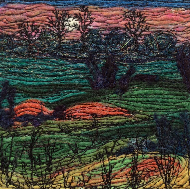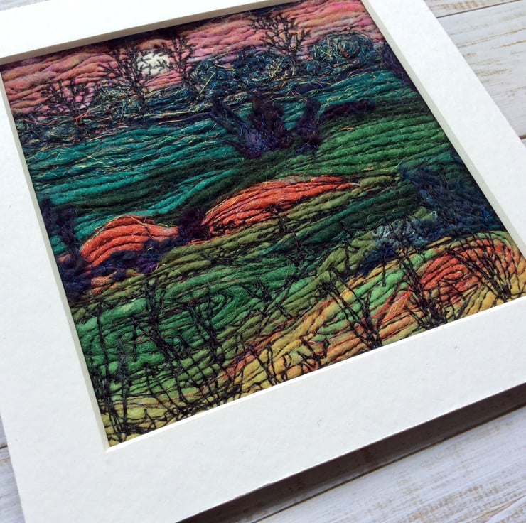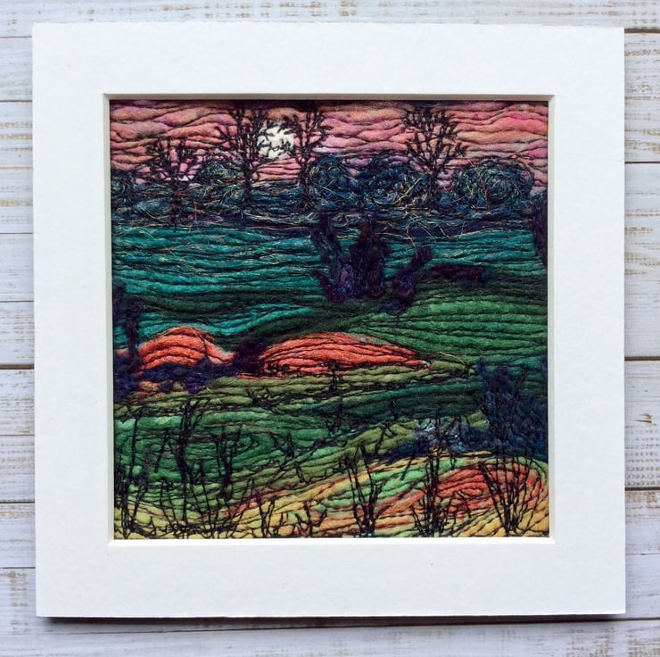 This original embroidered landscape features the moon shedding its light across a quiet scene. It’s sewn onto felt with merino wool and free motion embroidery, and it comes mounted. The artwork measures 12 x 12cm and the mount measures 14.5 x 14.5cm. The mount window measures 11 x 11cm.
