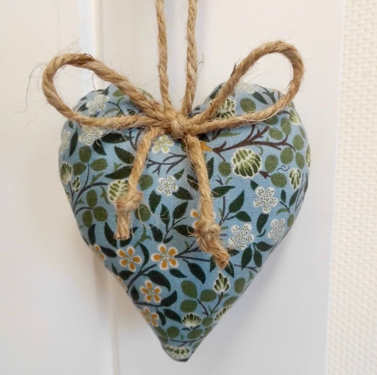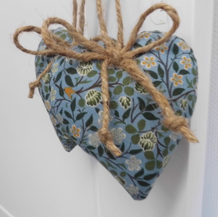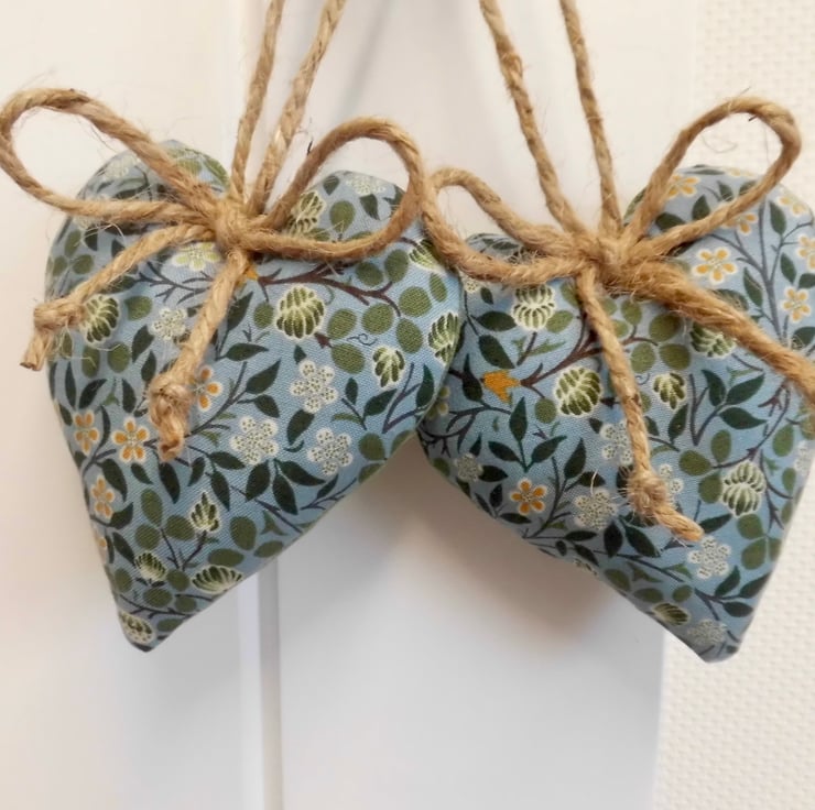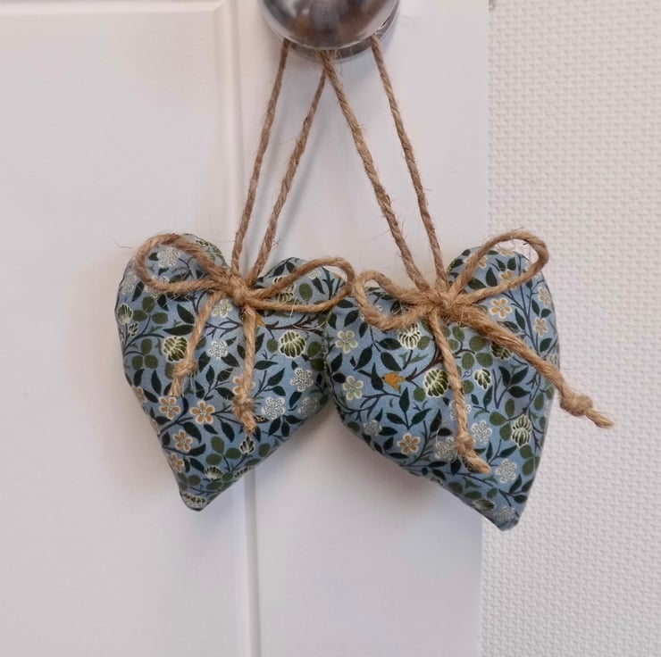 A pair of padded heart-shaped door hangers carefully made using a quality quilting cotton printed with William Morris' beautiful Clover design. The green fabric I have used for the backs works very well with the green in the print.