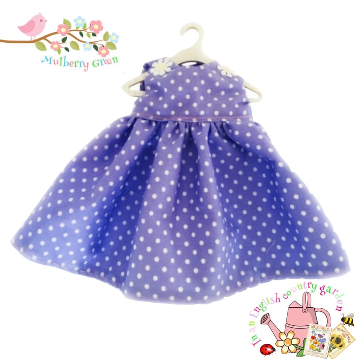 A sweet little lavender spot dress With daisies on the shoulders to fit the Mulberry Green characters. The dress is made from best quality cotton, has a full skirt, a lined bodice and comes on a cute little wooden hanger.