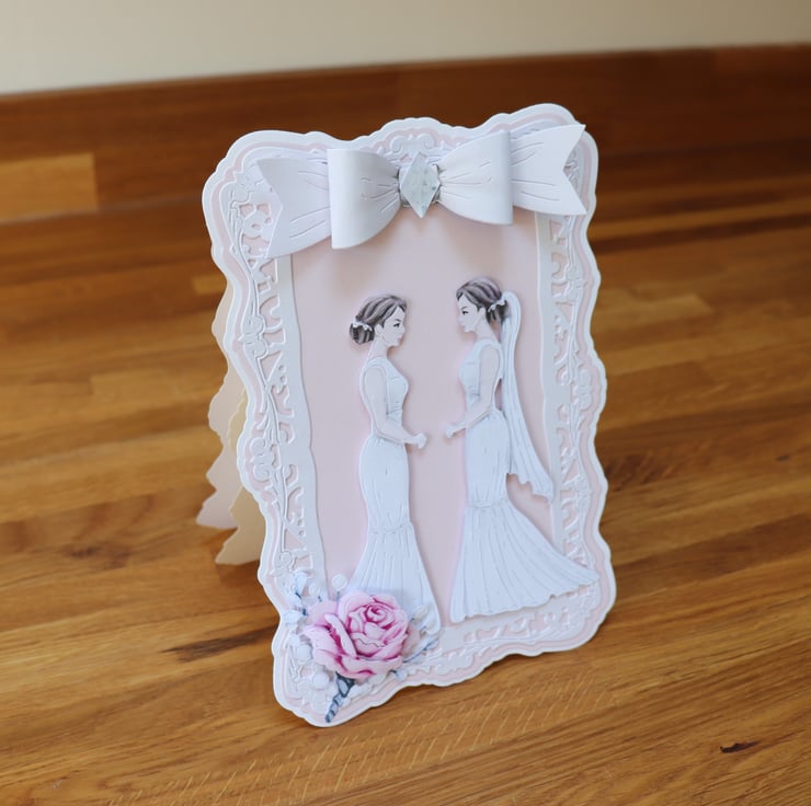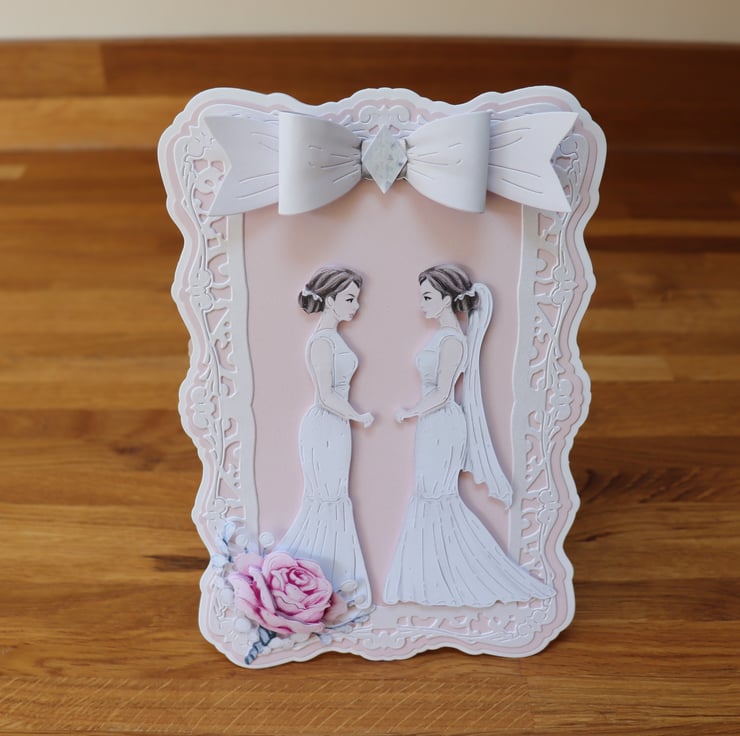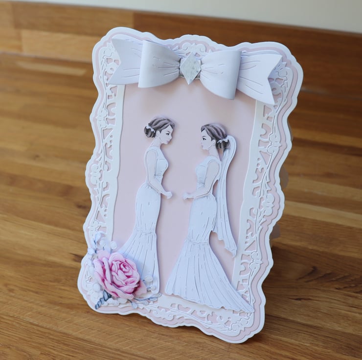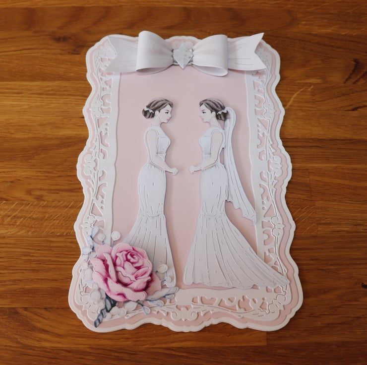 The Two Brides are on a back Ground of Pale Pink and surrounded with a pearl white Decorative Frame, and a rose bouquet on the bottom Left side.