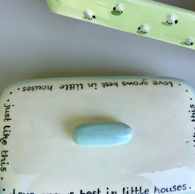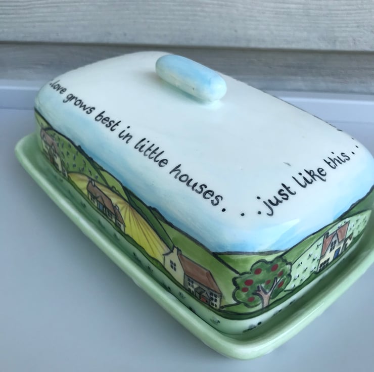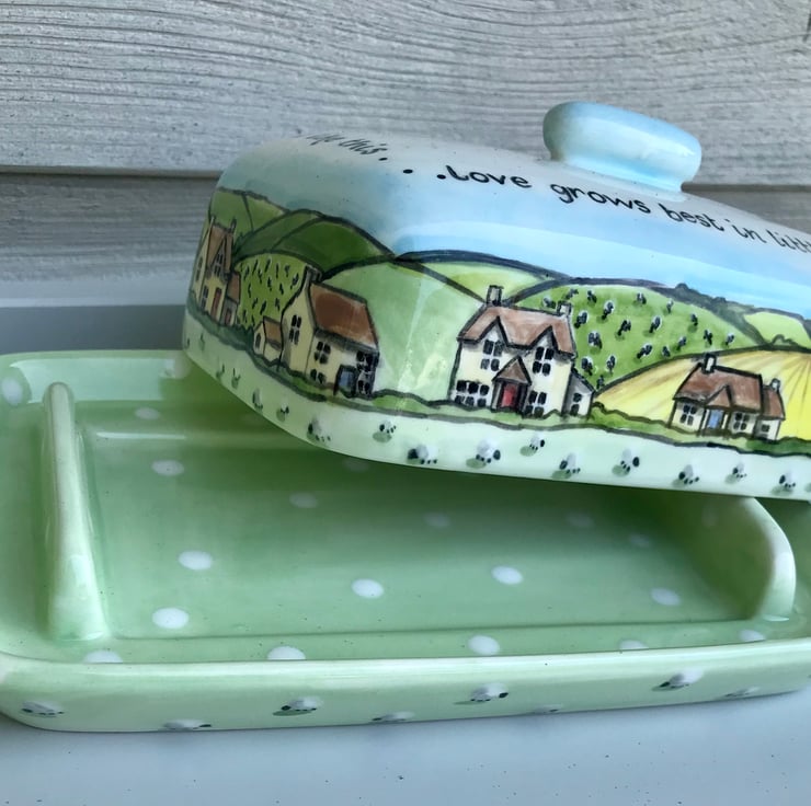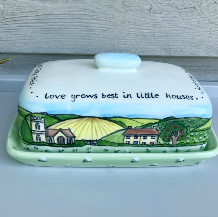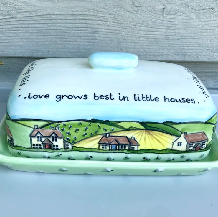 This butter dish is hand painted with little country houses, rolling countryside, a little country church and of course fields full of cows and masses of little sheep. Finished with a quote” love grows best in little houses, just like this around the lid. All individually painted by myself ensuring they are all unique.