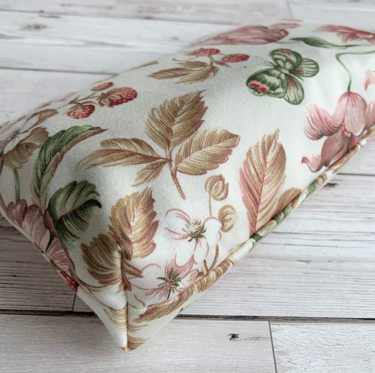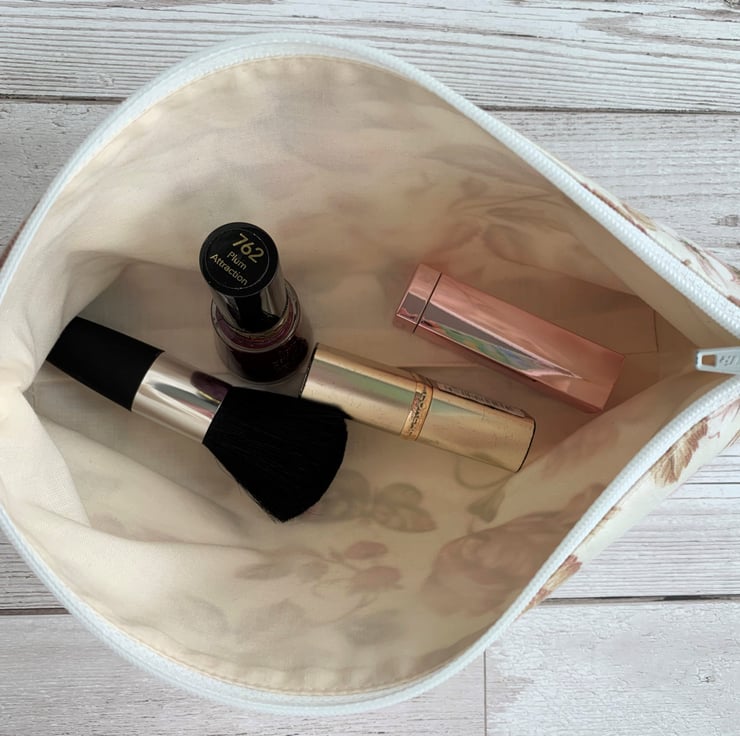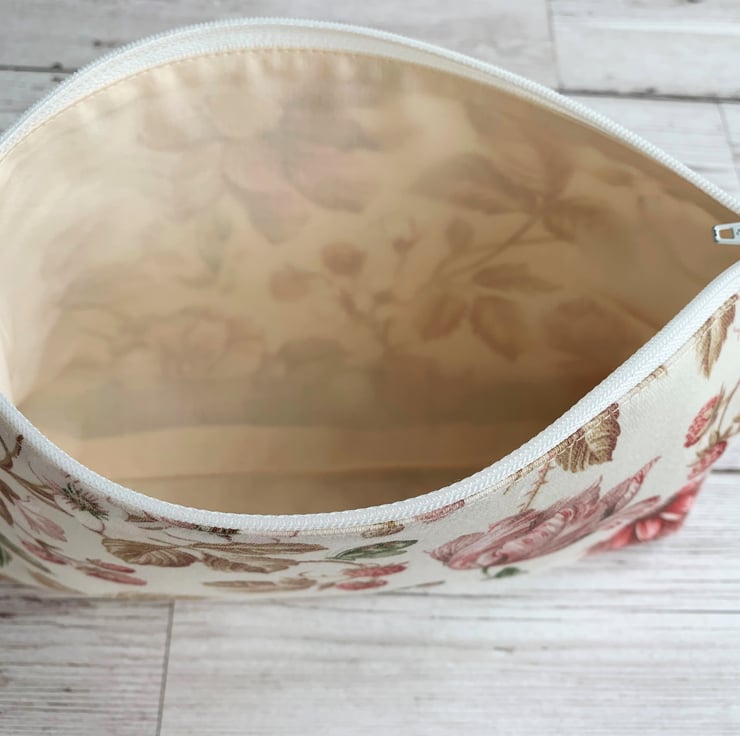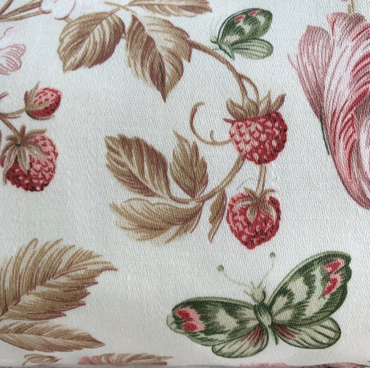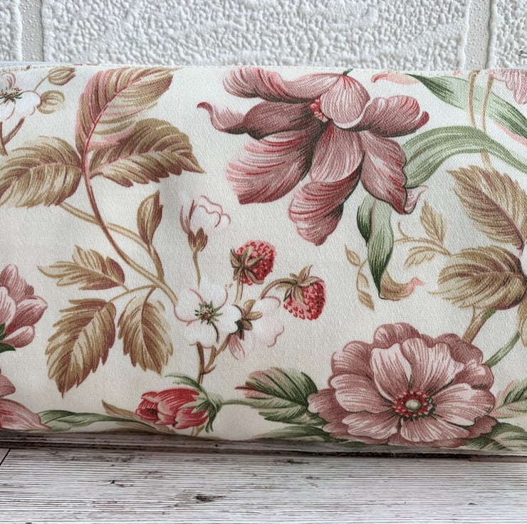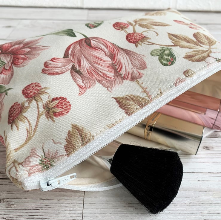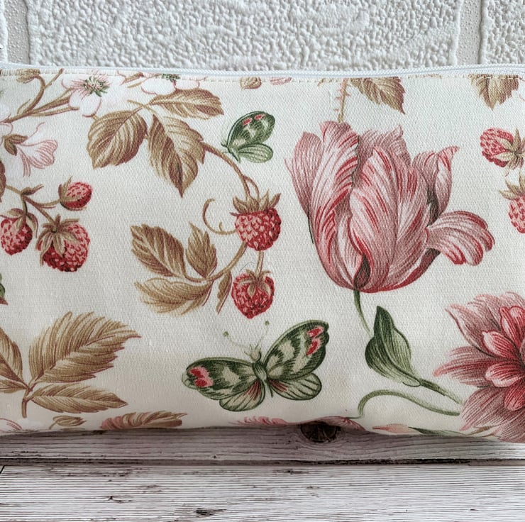 A pretty make up bag in "Wild Strawberries" print fabric. This delightful fabric features a pattern of clusters of wild strawberries, along with flowers, leaves and butterflies in lovely shades of pink, beige and green on a cream background. The cosmetic bag has a pale cream zip and is lined with cream fabric. The base of the bag is boxed to give extra space inside.