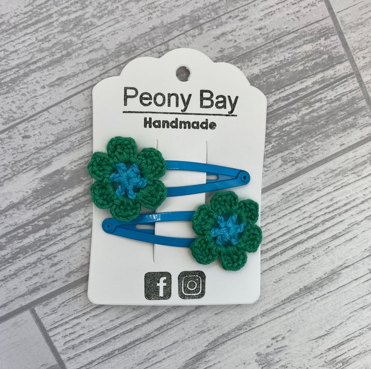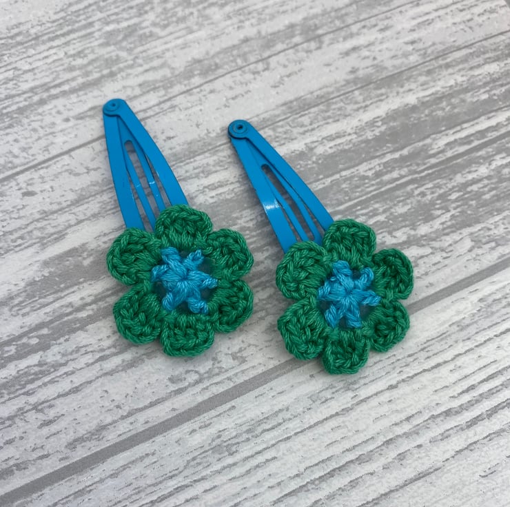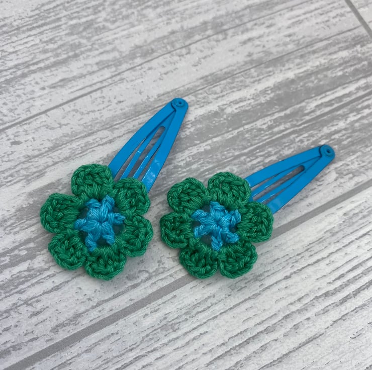 I love these watery colours! I’ve crocheted the centre of the flowers in blue cotton and used a green cotton for the six petals, then attached the flowers to blue snap clips.