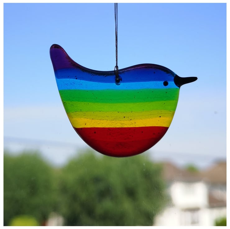This purchase is for one very cute and small 'Rainbow Wren of Hope' with a purple tipped head and back. He is suspended from a length of silver thread so you can hang him in the window to spread a little rainbow of hope and colour into your home and neighbourhood.