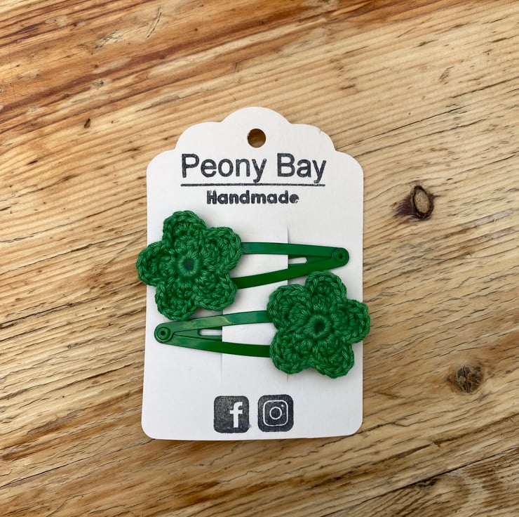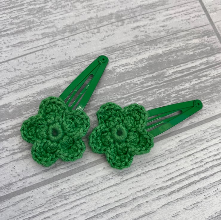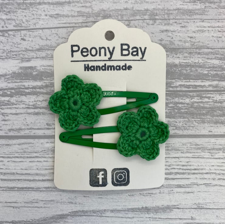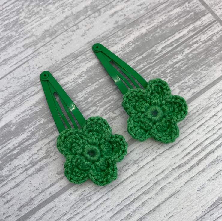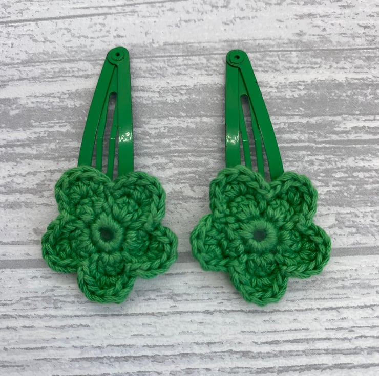 To make these hair clips I’ve crocheted the flowers in green cotton, then attached them to green snap clips.