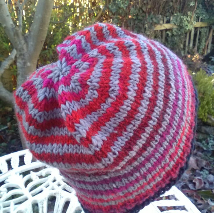 This colourwave has bold stripes of Reds, Pinks Purples and Grey.The bands are continuous as the hat is knitted on the round.