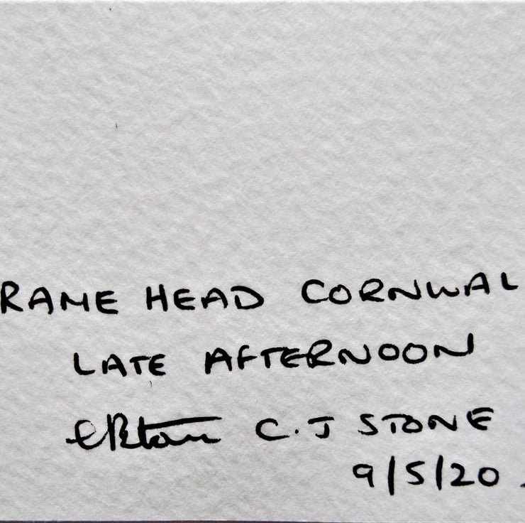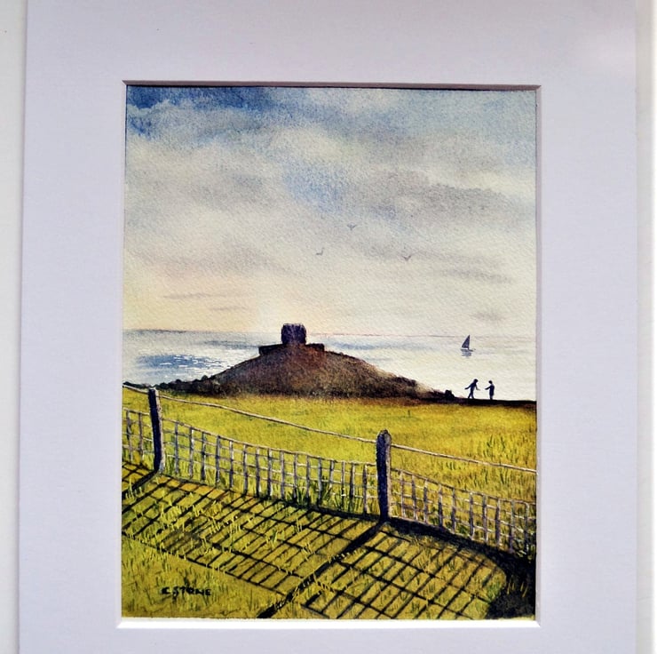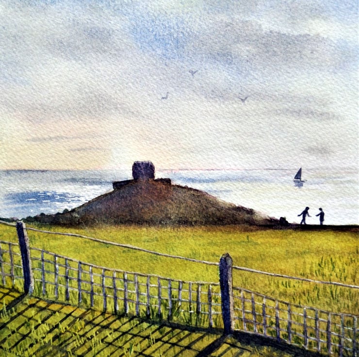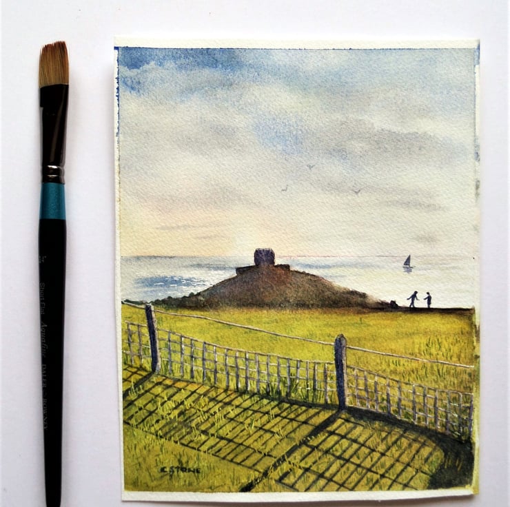 A small watercolour painting based on my own photographs, of Rame Head in south east Cornwall. It shows the silhouette of the chapel at the peak of the headland, against the late afternoon sun.