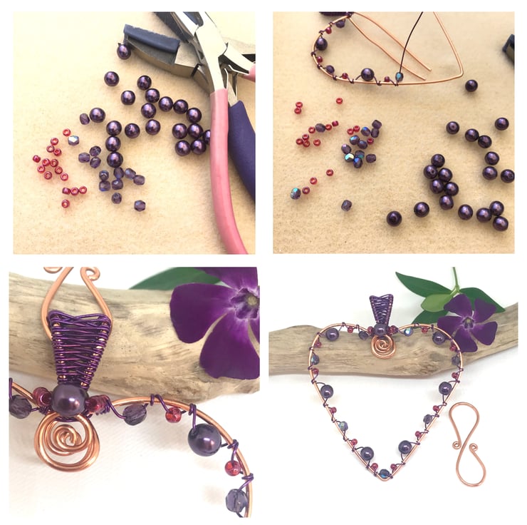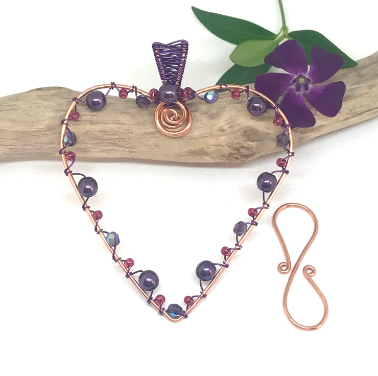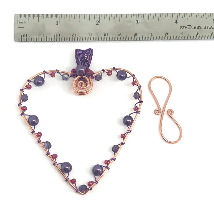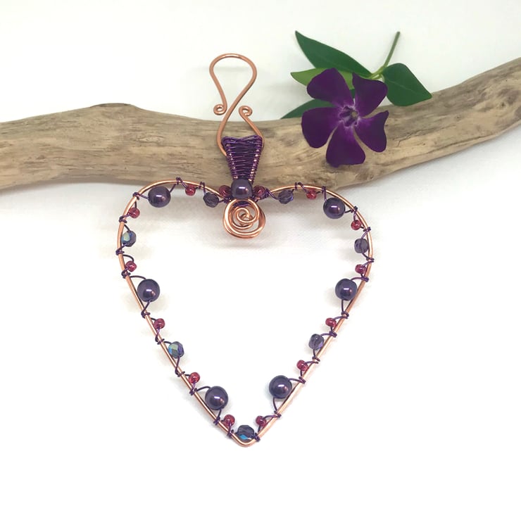 I have created this pretty heart with copper wire which I have formed into a heart shape with swirls at the top. Purple glass pearls, purple Czech crystal beads and pink seed beads are wrapped around the heart shape with purple coloured copper wire. A handcrafted hook is included for hanging.