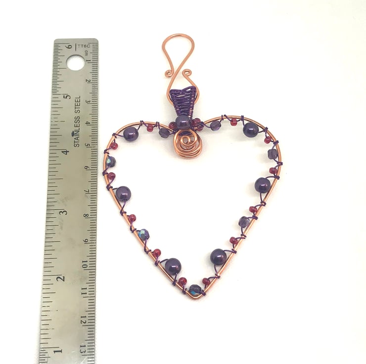 Pretty wire work heart decoration handcrafted in copper wire with purple and pink glass beads.