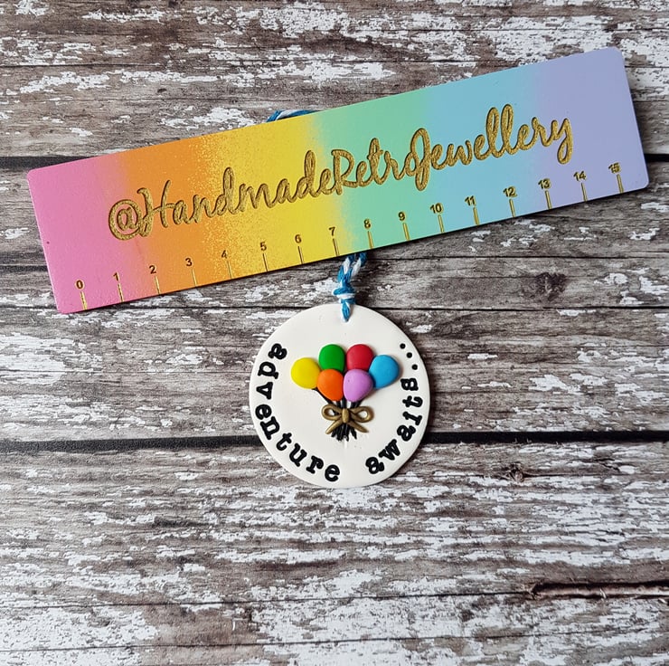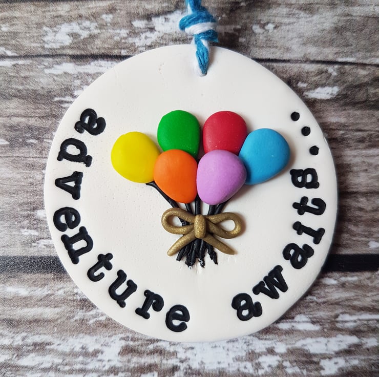 These cute little round shaped decorations are made of polymer clay, with the phrase "Adventure Awaits" stamped by hand using individual letters, along with some bright rainbow coloured balloons in a bunch, held together with a cute gold bow! Letter detail is hand painted using acrylic paint to finish.