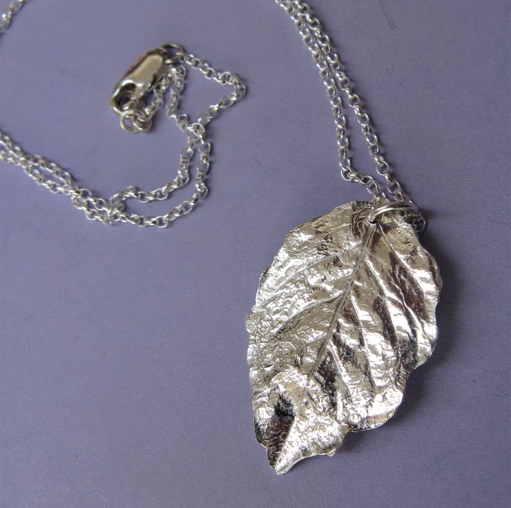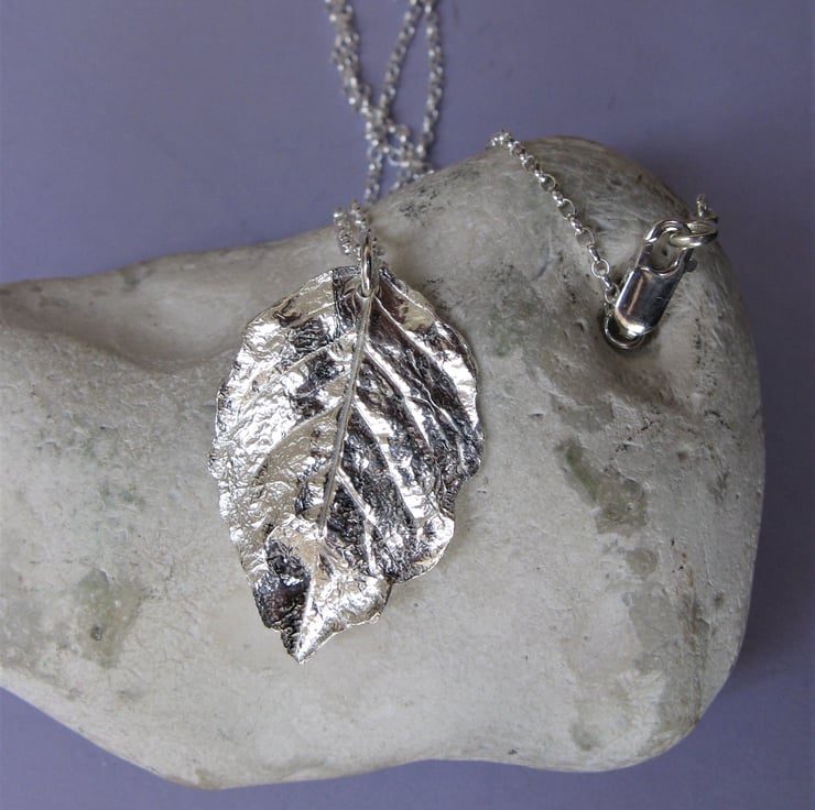 This beautiful necklace was made by coating a real rose leaf in multiple layers of recycled fine silver (pure silver), leaving a detailed replica after firing.