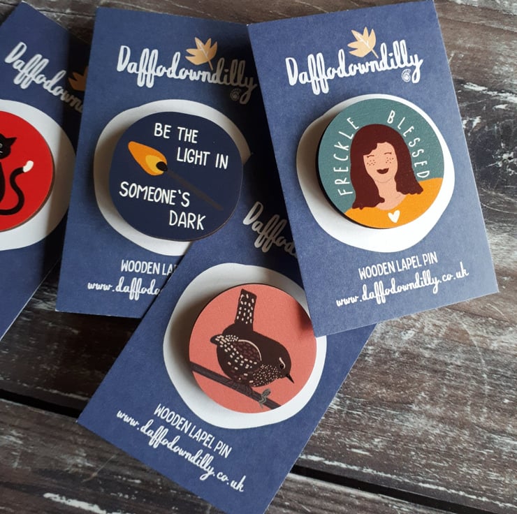 The badges are 35mm in size and the wood is digitally printed with my designs before being laser cut into the little circles. They are then displayed on a recycled paper backing card.