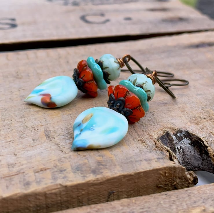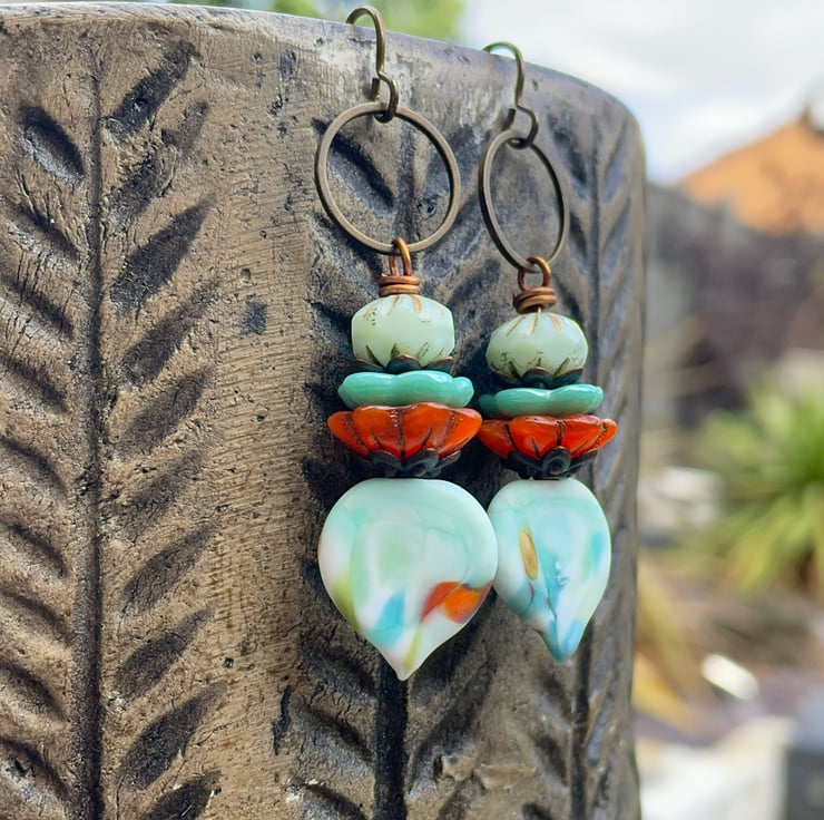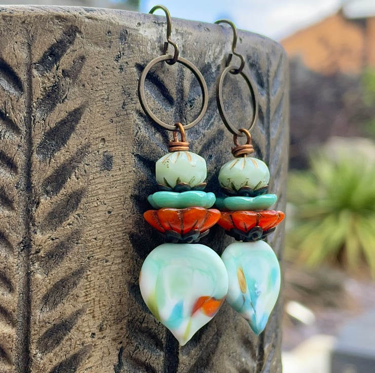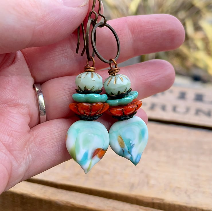 Above them sits a rustic mix of beads – Czech glass pinwheel flowers and cruller beads, along with dark copper flower caps. The beads are suspended from large antiqued brass rings, giving the earrings beautiful movement and a touch of bohemian style.