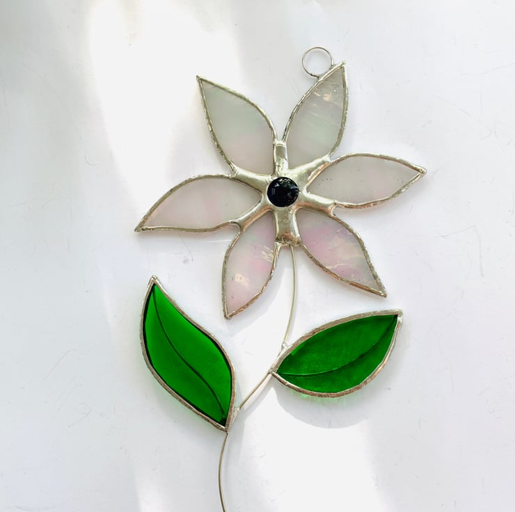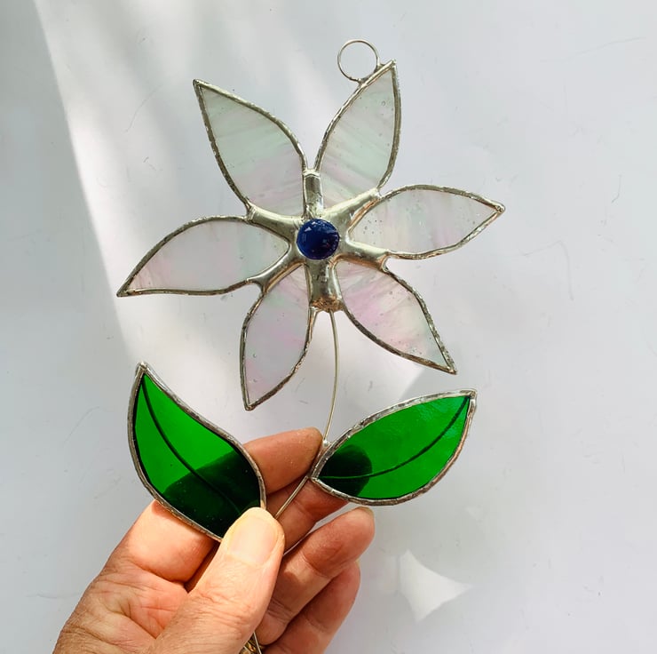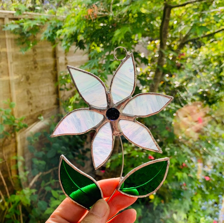 The glass used in this suncatcher is a iredised white streaky sea glass with an purple glass nugget for the centre for the flower and green corella glass for the leaves.