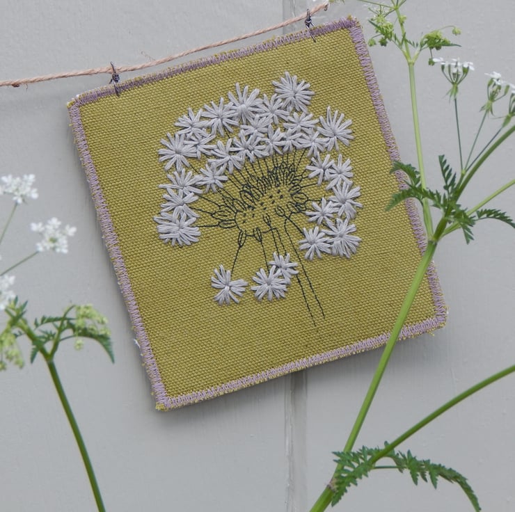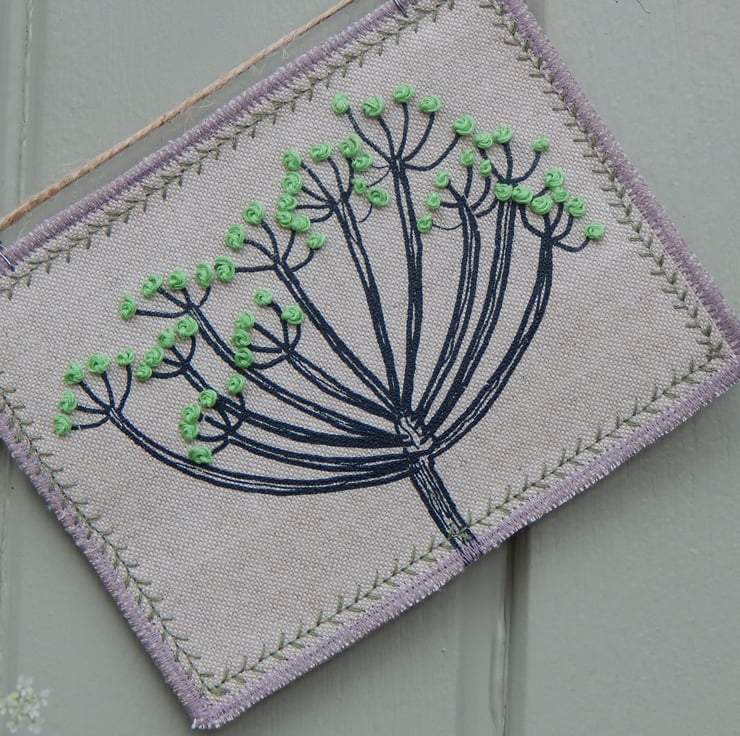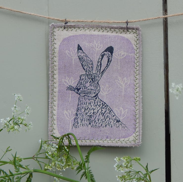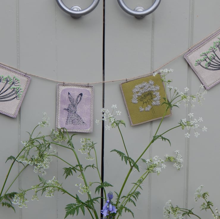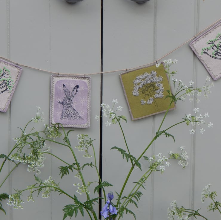There is 1 hare screen printed with a purple lino print background, there are 2 cow parsleys printed with hand embroidered French knot blossoms and 1 dandelion clock also hand embroidered.