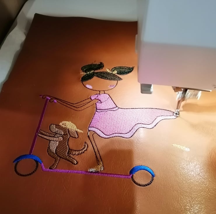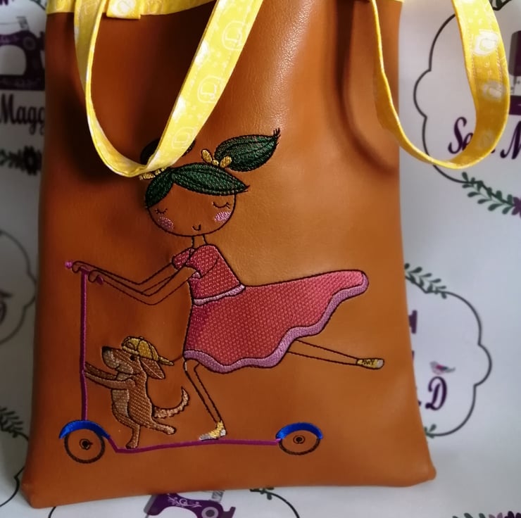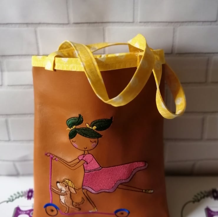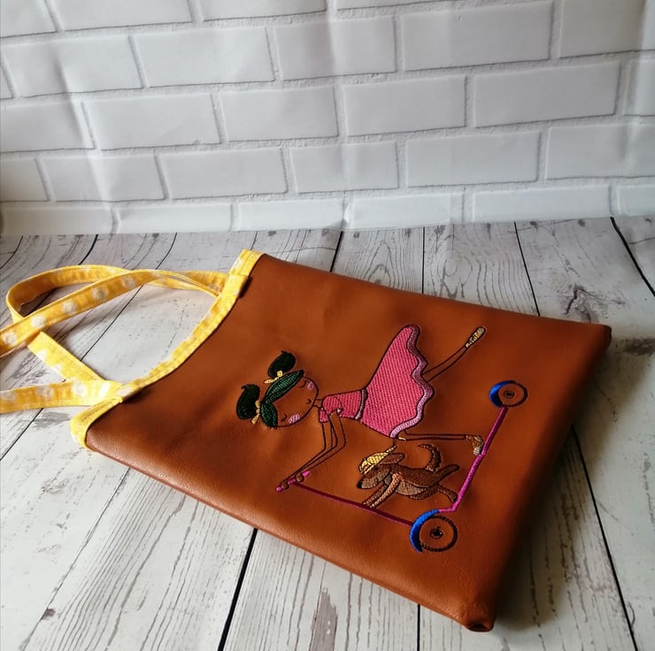 Gorgeous embroidered child's tote bag made in a tan colour faux leather and lined in a yellow patterned 100% cotton fabric. The bag has a girl on a scooter with her cute dog embroidered on the front. This is a perfect gift for the little miss, who likes to carry her bag with her. Every girl loves a new bag.