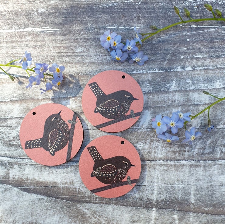 They are around 38mm in size and the wood is digitally printed with my designs before being laser cut into the little circles. They come displayed on a recycled paper backing card.