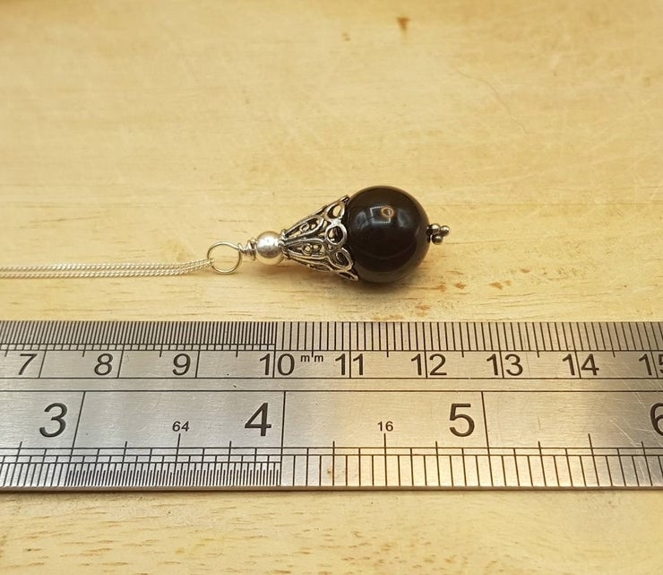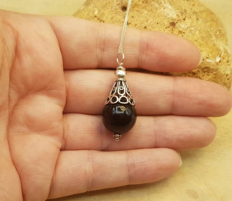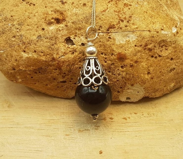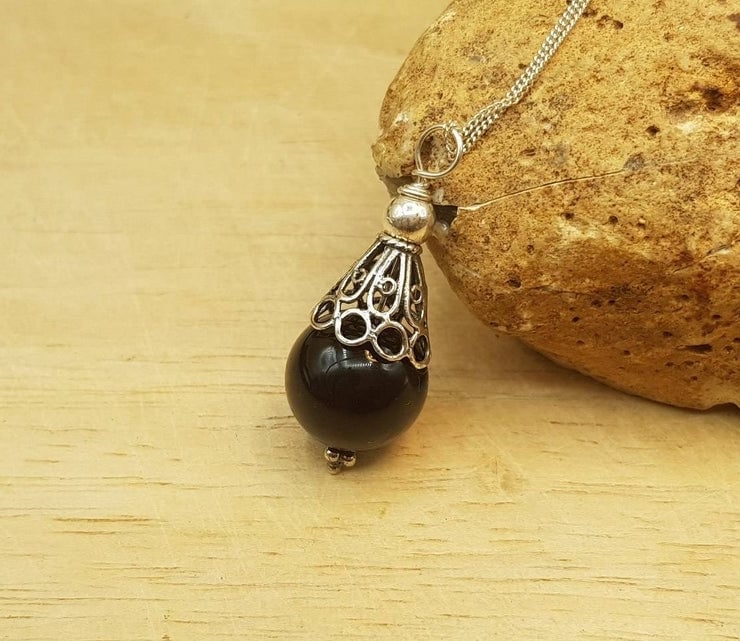 This is a women's minimalist Black Onyx cone pendant necklace. Wire wrapped with sterling silver wire and Bali silver beads. Bali silver is up to 99% silver but is not hallmarked or stamped.