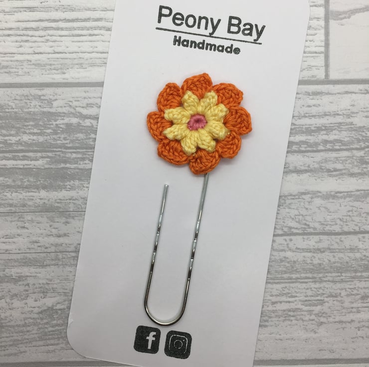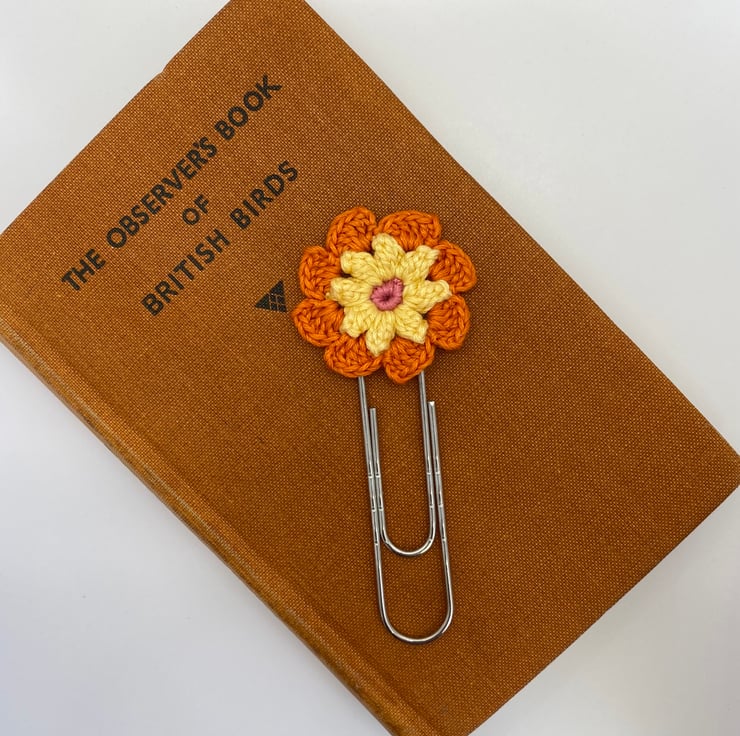 The shape of this flower reminds me of the plastic flowers on a stick that spin in the wind! To make this pretty bookmark I used pink cotton to crochet the centre of the flower, then a pale yellow cotton to crochet the first round of petals, and finally orange cotton to crochet the 8 outer petals. I crochet over the top of the bookmark so the flower is perfectly secure, it does move but it can’t come off (unless you slide it along the shape of bookmark!).
