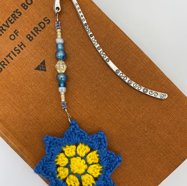 To make this bookmark I’ve combined a crochet flower with upcycled beads. I crocheted the flower in lovely blue and yellow cotton. I added a mix of beads in complementary shades and set it on a silver tone bookmark.