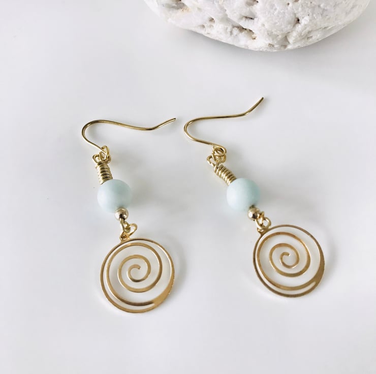 Stylish ocean inspired dangle earrings. I coiled brass wire to make the top and added frosted 8mm amazonite round beads in shades of gorgeous pastel shades of blue.
