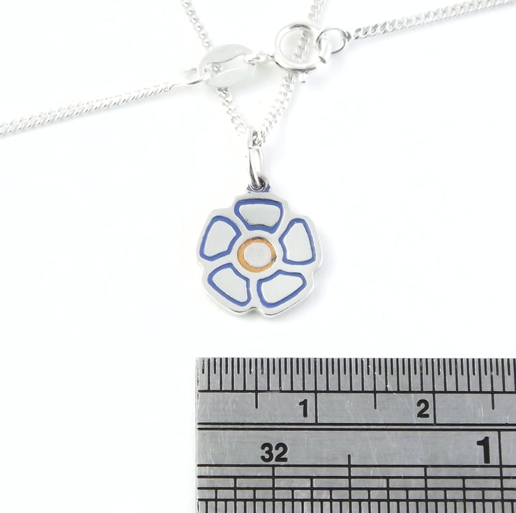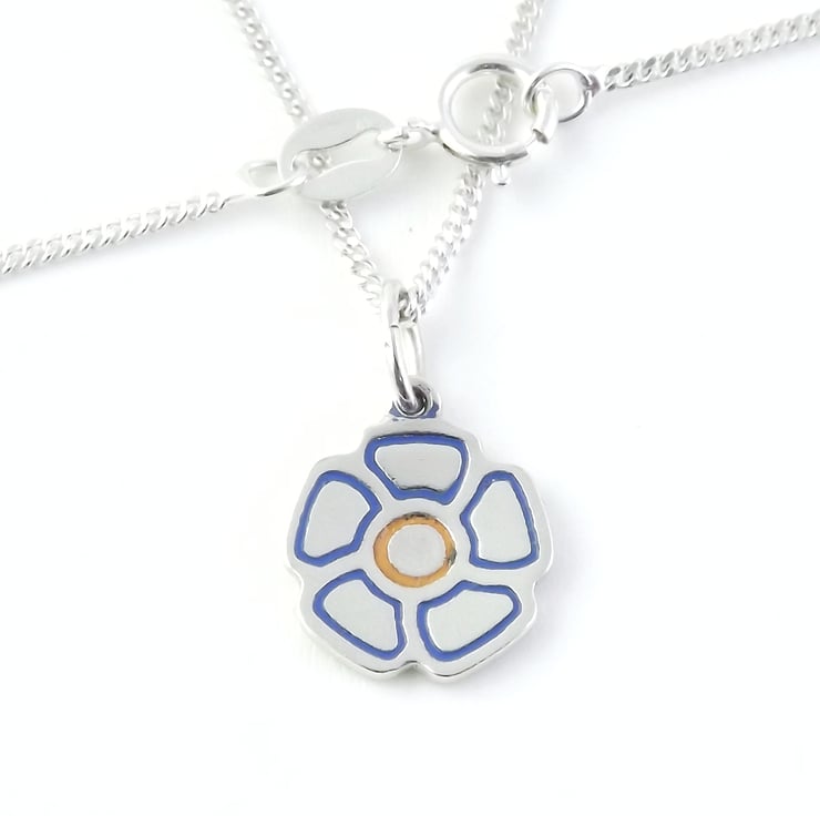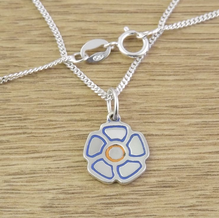 This flower pendant has been lovingly crafted by hand in Shropshire. It is made from sterling silver sheet and is etched before being cut by hand. The edges are then smoothed using files and emery paper before it is given it's shape using a punch and hammer. A 5mm oval jump ring is then attached. An orange resin based enamel is added to the centre of the pendant and a colour of your choice is added to the petals, the piece is then polished before being attached to a chain.