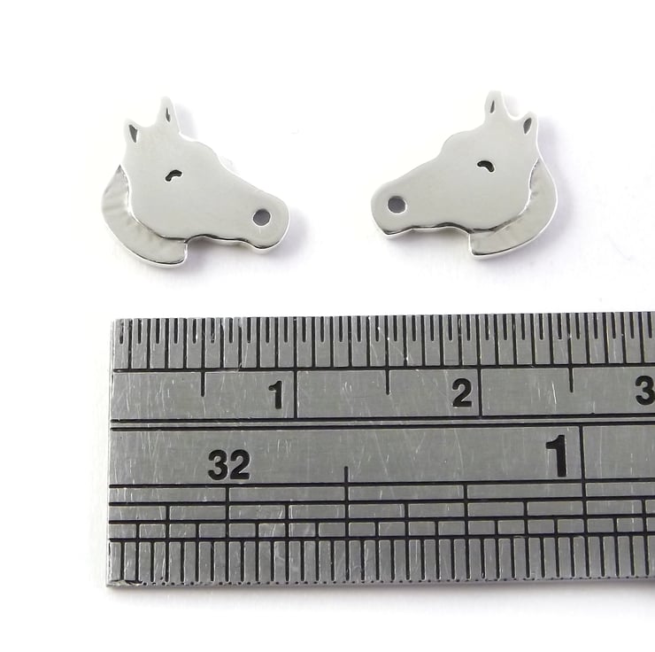 These handmade sterling silver horse stud earrings have been lovingly crafted by hand in Britain. They are made from sterling silver sheet and are etched before being cut by hand, the edges are then smoothed using files and emery paper before the earrings are carefully given there shape using a punch and hammer. 11mm ear pins are then soldered onto the back. Grey and black resin based enamels are added to the etched areas and then the earrings are polished.