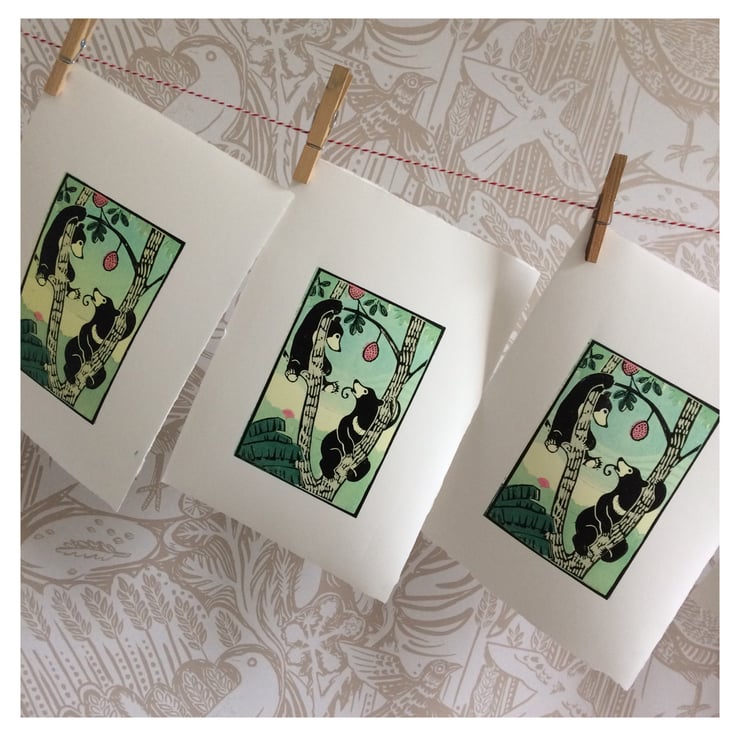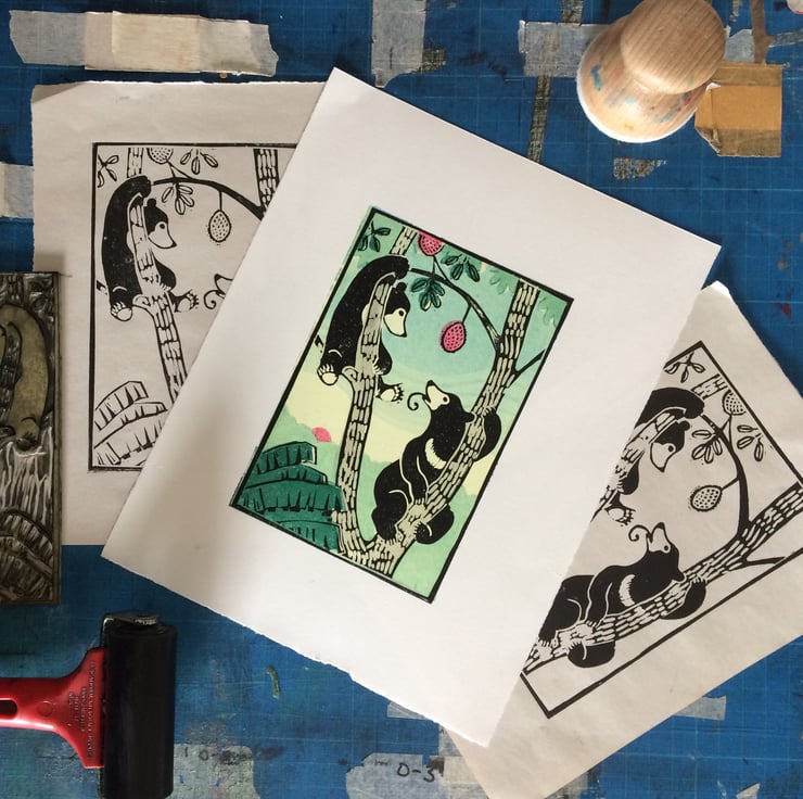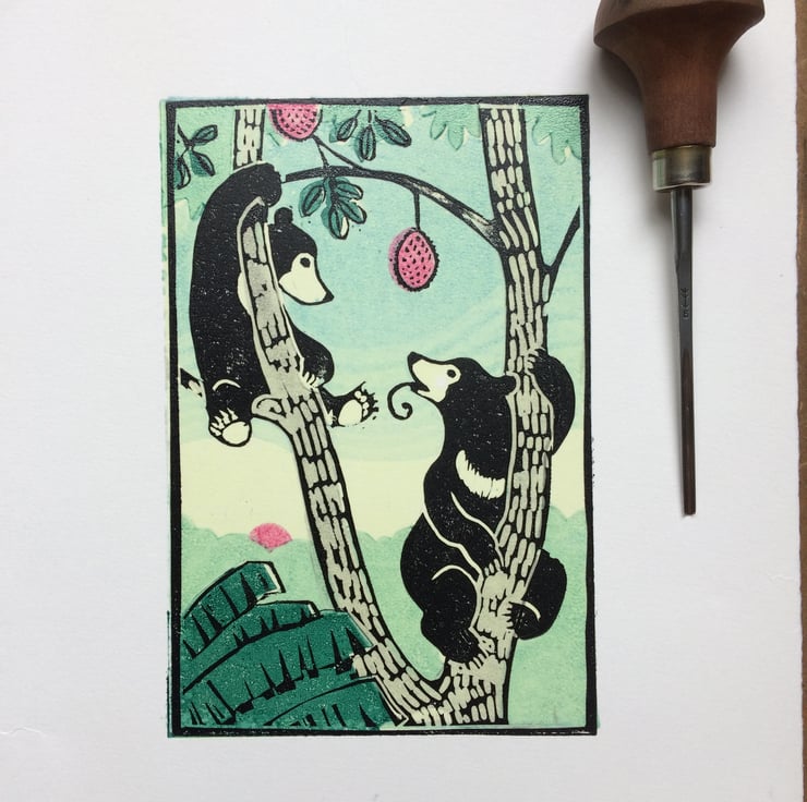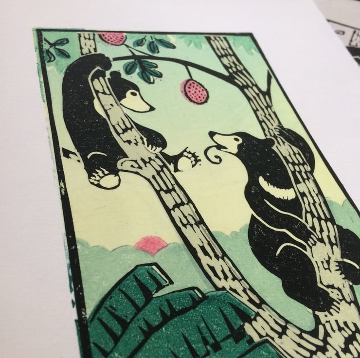 This tranquil scene of bears feasting high up a tree at sunset is based on Noko and Hunny, two sun bears who live at Cikananga Wildlife Centre in Indonesia. In the wild, sun bears spend most of their time up in trees feeding and sleeping. It's an original Lino print, one of a small edition of only five prints in these colours and is numbered, signed and titled. The print area measures 10cm x 15cm and is printed on to Zerkall paper with Cranfield inks. Slight off-setting and colour variations are due to hand-printing techniques and each print will vary slightly but adds to its uniqueness. Shown framed for display purposes only. The print will be posted out flat, backed with card and carefully wrapped. All profit goes to Cikananga Wildlife Centre. You can also buy it at a reduced price as a digital art print (see other listing).