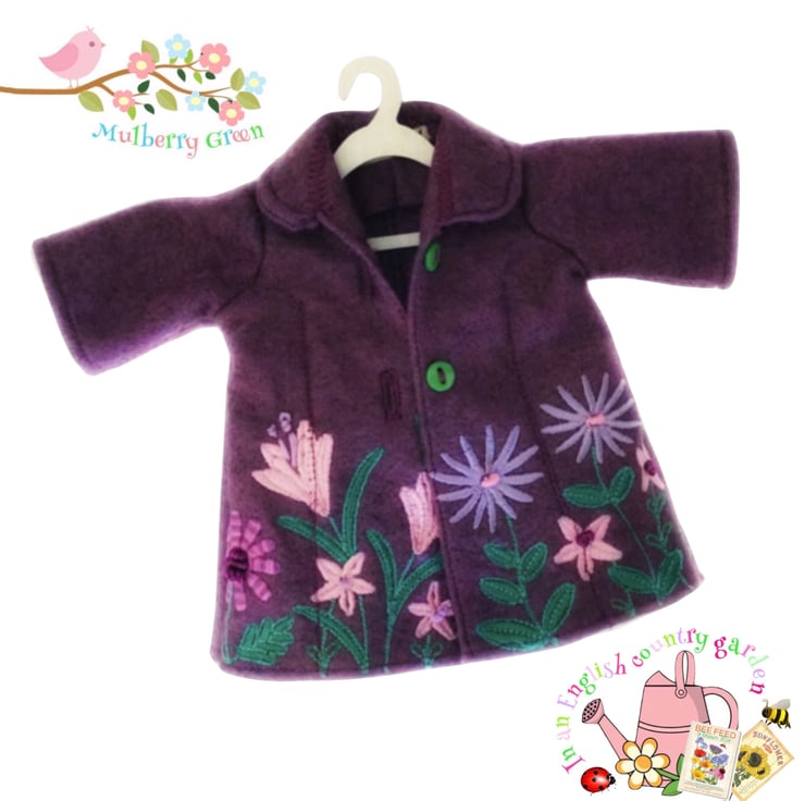 A gorgeous purple tailored coat to fit the Mulberry Green dolls. The coat is machine and hand embroidered with meadow flowers and fastens with two little green buttons. It comes on a little wooden hanger.