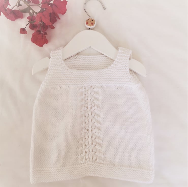 The dress is knitted in garter stitch and stocking stitch with a simple lace panel on the front.