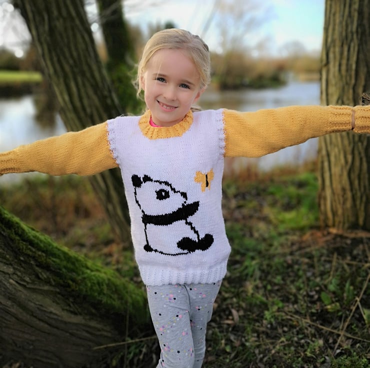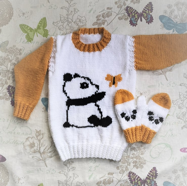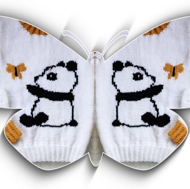A knitting pattern for an Aran/Worsted (10 ply) Sweater and Mittens featuring Pandas and Butterflies.
