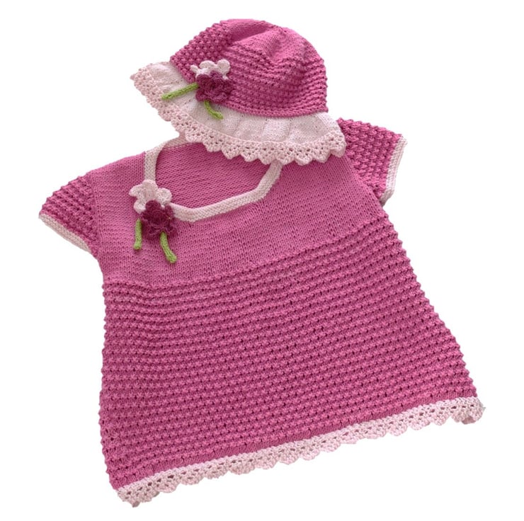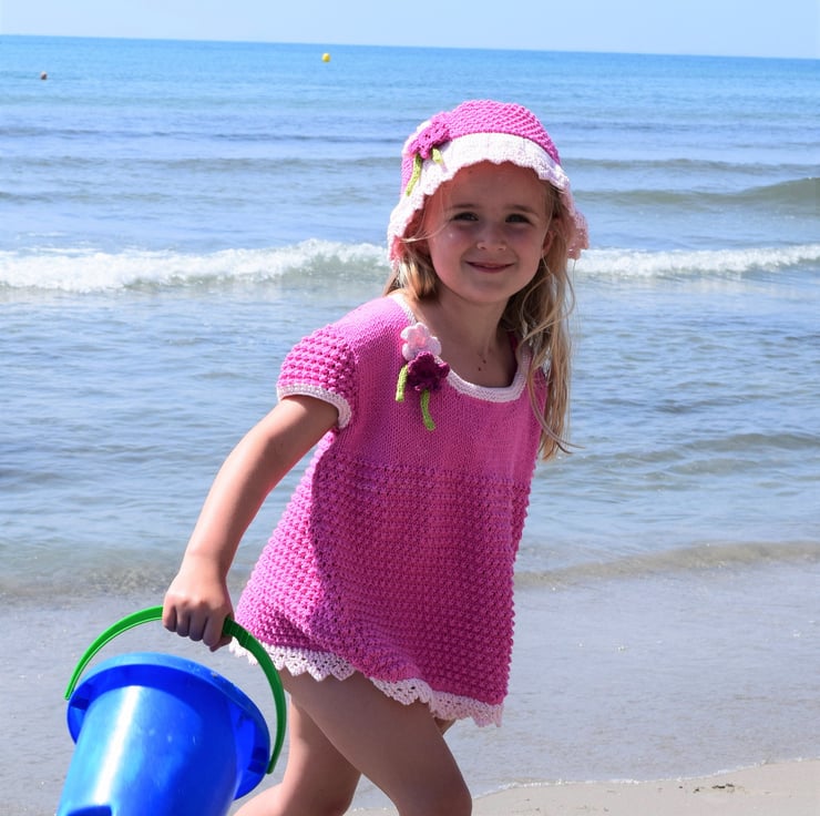 The top can be knitted with either short or long sleeves and has knitted contrast flowers. The hat is light and perfect for warm weather. Full instructions are given for knitting the lace panels.