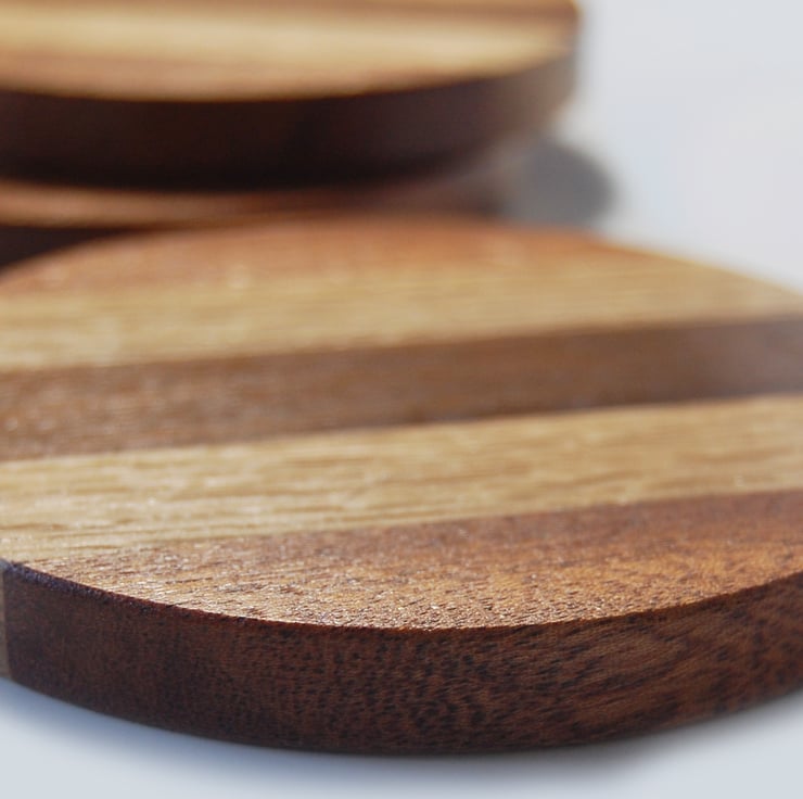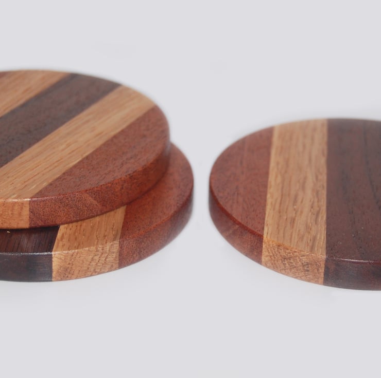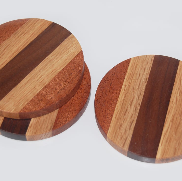 Set of 3 round handmade Black Walnut, Oak & Sapele Drink Coasters in a symmetrical striped pattern, coated with a food-safe, water & alcohol resistant satin finish.