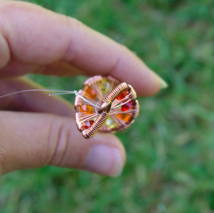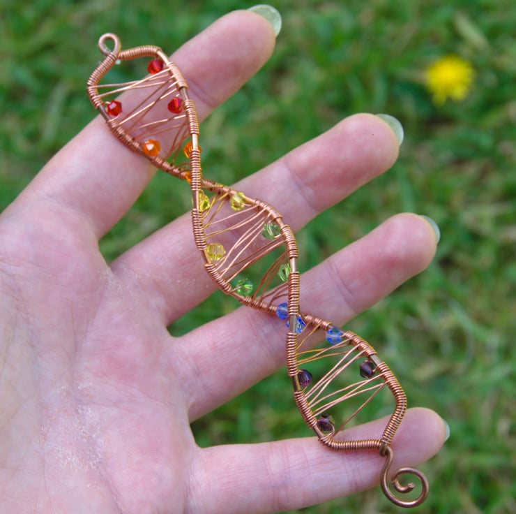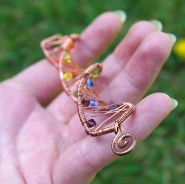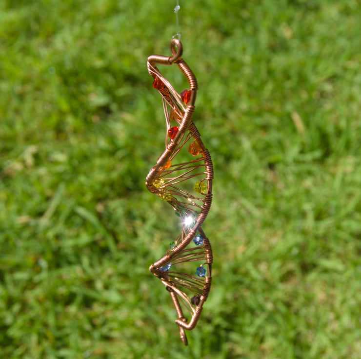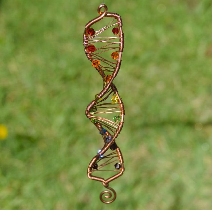 This pretty rainbow wind spinner is mesmerising to watch & sure to bring a smile to your face! I've formed a frame from hard copper wire. I've then woven finer wire within the frame, adding 4mm glass bicone beads in rainbow colours - the facets twinkle as the sun catches the moving spinner. The finished piece is then twisted into the double helix shape.