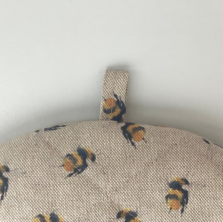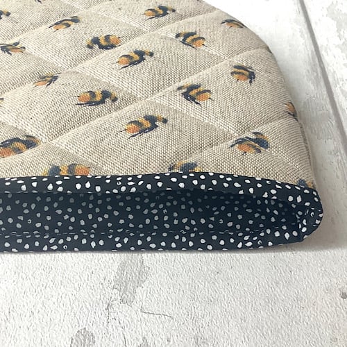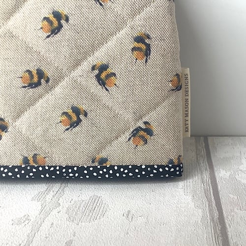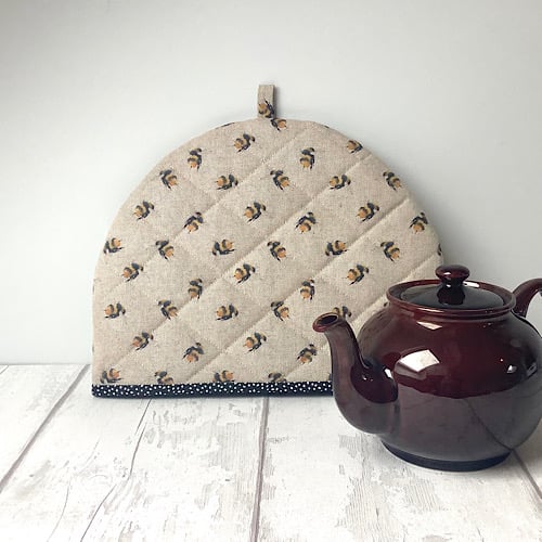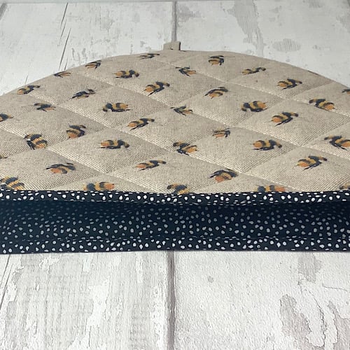 Tea cosy in a nature inspired bee print fabric. Quilted and lined in black spot cotton. 31cm wide by 23cm high. Matching coasters available with this item.