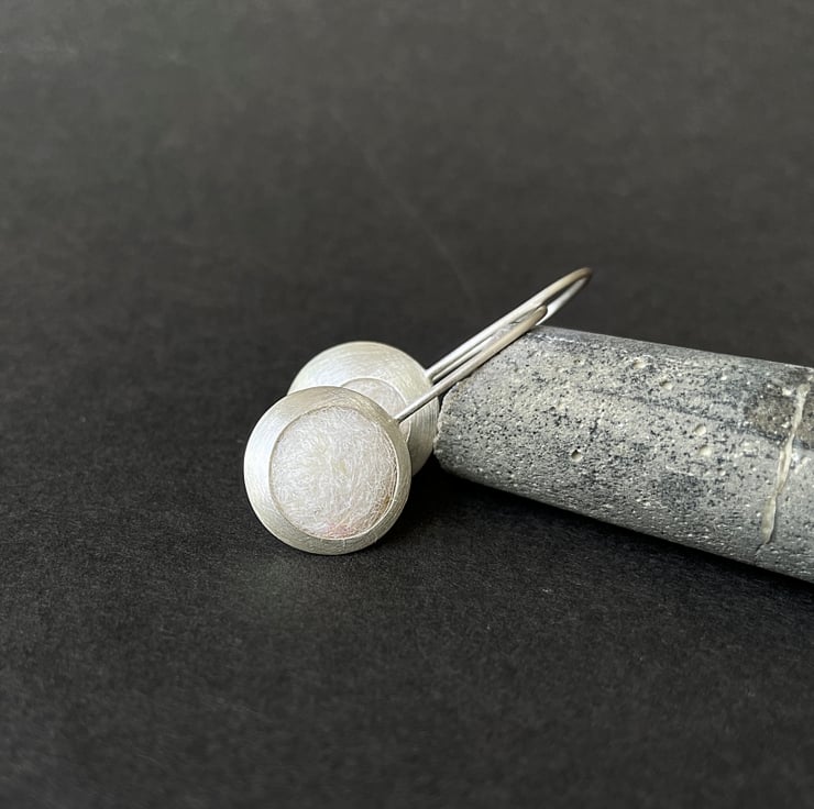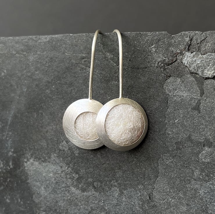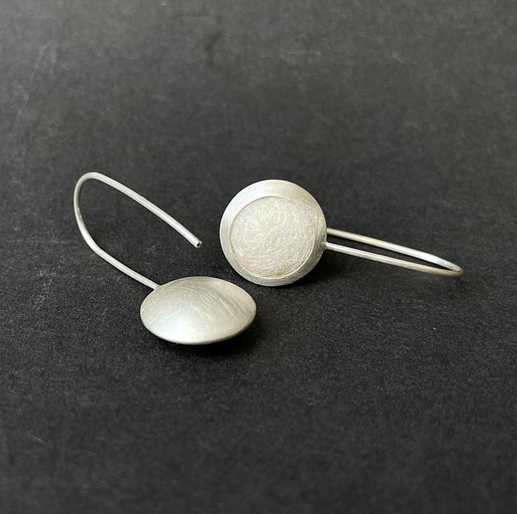 Unique contemporary handmade sterling silver discs earrings with a white felt.