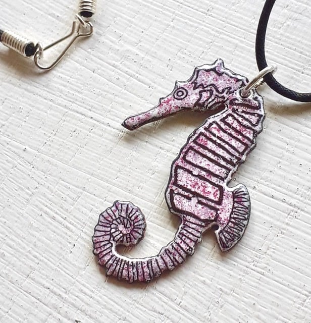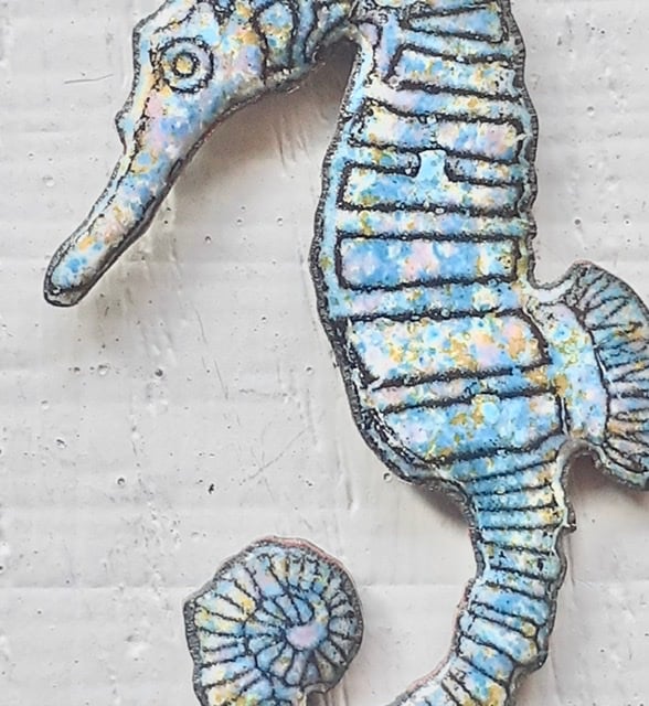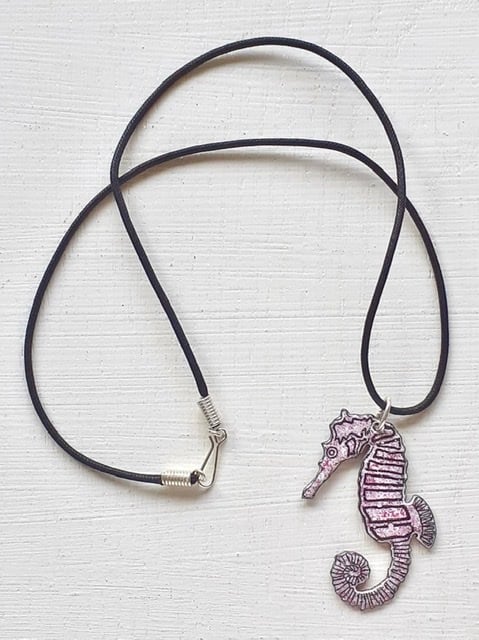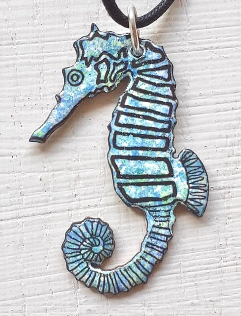 I hand cut this copper shape to my design and enamel it on both sides to give it colour, strength and resilience. The reverse has a mixed colour enamel. It measures approximately 50mm by 30mm at its widest point. I offer it in choice of colours . The Seahorse Pendant hangs from a black cord with a silver-plated fastener and there are a choice of cord length to choose from. It is presented in a quality card gift box and sent by Royal Mail ‘Tracked’ postage.