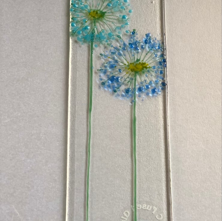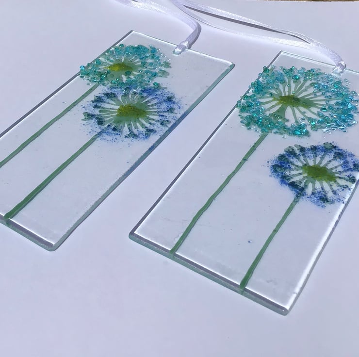 Made by hand in my kiln this popular dandelion design hanging are such light reflecting blue glass they are beautiful . They take around 12 hours in my kiln . Dandelions are so delicate and always make me think of “make a wish “ . They measure 15cm x 6.5 cm .and are drilled and strung with ribbon ready to hang on your wall or window